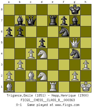 Last move : 0-1 2023 March 14 16:9:9 [Event "FICGS__CHESS__CLASS_B__000363"] [Site "FICGS"] [Date "2022.11.17"] [Round "1"] [White "Trigance,Emile"] [Black "Hepp,Henrique"] [Result "0-1"] [WhiteElo "1851"] [BlackElo "1900"] 1.e4 c5 2.Nf3 e6 3.d4 cxd4 4.Nxd4 a6 5.Bd3 Qc7 6.O-O Nf6 7.Qe2 d6 8.c4 Be7 9.b3 O-O 10.Bb2 b6 11.Nd2 Bb7 12.Kh1 Nbd7 13.Bc2 g6 14.f4 Rfe8 15.f5 exf5 16.exf5 Bf8 17.Qf2 Bg7 18.fxg6 hxg6 19.h3 Re7 20.Rae1 Rae8 21.Rxe7 Rxe7 22.Re1 Ne5 23.Ba1 d5 24.Qh4 g5 25.Qxg5 Neg4 0-1 Follow this game move after move (download)The isolated Pawn casts gloom over the entire chessboard. (Aaron Nimzovich) Der Verteidiger gebe der Gewalt nach, aber nur der Gewalt. Er schaffe sich nicht freiwillig, etwa aus Blindheit oder aus Schrecken, irgendwelche Schwächen. Er lasse sich nicht bluffen. (Emanuel Lasker) Hasta este punto, las blancas han seguido un análisis bien conocido. Pero ahora el hace un error fatal: empieza a usar su propia cabeza. (Siegbert Tarrasch) Horreur, mais aussi harmonie suprême : qu'y avait-il en effet au monde en dehors des échecs ? Le brouillard, l'inconnu, le non-être... (Vladimir Nabokov) The real voyage of discovery consists not in seeking new lands but in seeing with new eyes. (Marcel Proust)