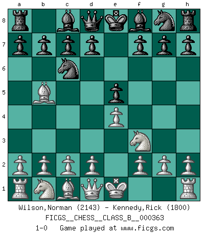 Last move : 1-0 2022 December 29 1:42:7 [Event "FICGS__CHESS__CLASS_B__000363"] [Site "FICGS"] [Date "2022.11.17"] [Round "1"] [White "Wilson,Norman"] [Black "Kennedy,Rick"] [Result "1-0"] [WhiteElo "2143"] [BlackElo "1800"] 1.e4 e5 2.Nf3 Nc6 3.Bb5 1-0 This chess game has been lost on time (started : 2022.11.17 20:46:31) Follow this game move after move (download)There is only one thing Fischer does in Chess without pleasure: to lose ! (Boris Spassky) Zum Sieg gelangt man nicht, wenn man gut, sondern nur wenn man besser spielt (Savielly Grigorievitsch Tartakower) Aquel que ve no otra dirección en el juego que la de dar Jaque Mate a su oponente, nunca será un buen jugador de Ajedrez. (Euwe) Votre seul travail dans les ouvertures est d'obtenir un milieu de partie jouable. (Lajos Portish) The mind is like a parachute, it only functions when its open. (Unknown)