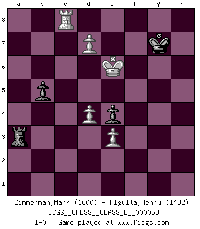 Last move : 1-0 2007 December 11 14:47:42 [Event "FICGS__CHESS__CLASS_E__000058"] [Site "FICGS"] [Date "2007.08.17"] [Round "1"] [White "Zimmerman,Mark"] [Black "Higuita,Henry"] [Result "1-0"] [WhiteElo "1600"] [BlackElo "1432"] 1.e4 e5 2.Nf3 Nc6 3.Bc4 d6 4.Nc3 h6 5.a3 Nf6 6.d3 a6 7.O-O Be6 8.Nd5 Bg4 9.h3 Bh5 10.c3 Be7 11.Re1 O-O 12.Nxf6+ Bxf6 13.g4 Bg6 14.Nh2 Bh4 15.Rf1 Bg5 16.Be3 Bxe3 17.fxe3 Kh7 18.Qf3 f6 19.Rf2 Bf7 20.Bxf7 Rxf7 21.h4 g5 22.hxg5 hxg5 23.Qh3+ Kg7 24.Nf1 Qh8 25.Rh2 Qxh3 26.Rxh3 Rh8 27.Kg2 Rxh3 28.Kxh3 Kg6 29.Ng3 Ne7 30.Nf5 d5 31.Nxe7+ Rxe7 32.exd5 e4 33.d4 b5 34.c4 f5 35.cxb5 axb5 36.gxf5+ Kxf5 37.Rf1+ Kg6 38.Kg4 Rh7 39.Rc1 Rh2 40.Rc6+ Kf7 41.Kxg5 Rxb2 42.Rxc7+ Ke8 43.Kf5 Rb3 44.Ke6 Kf8 45.d6 Rxa3 46.Rc8+ Kg7 47.d7 1-0 King's pawn game Kingside Castling by player White (move 7) Kingside Castling by player Black (move 11) 10 pieces endgame at move 42 : White KRPPPP , Black KRPP WHITE : King + 1 Rook 4 Pawns BLACK : King + 1 Rook 2 Pawns 9 pieces endgame at move 45 : White KRPPP , Black KRPP WHITE : King + 1 Rook 3 Pawns BLACK : King + 1 Rook 2 Pawns Player White won this chess game. Follow this game move after move (download)When you absolutely don't know what to do anymore, it is time to panic. (John van der Wiel) Der Freibauer hat für mich eine Seele, genau wie der Mensch, Wünsche, die unerkannt in ihm schlummern, und Befürchtungen, von deren Existenz er selbst kaum ahnt. (Aaron Nimzowitsch) Cuando estes solo, cuando te sientas un extraño en el mundo, juega al Ajedrez. Esto levantará tu espiritu y será tu consejero de guerra. (Aristóteles) Il n'y a plus de joueurs du niveau de Jacob Murray dont la seule quête est le beau jeu, le plaisir de voir les pièces construire quelque chose. Sur 10 idées à la minute, 9 seront sans intérêt, la dernière s'avèrera géniale. (Christian Bauer) I just play for fun. (Anna Kournikova)