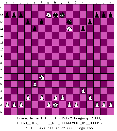 Last move : 1-0 2023 May 4 6:16:48 [Event "FICGS__BIG_CHESS__WCH_TOURNAMENT_01__000015"] [Site "FICGS"] [Date "2022.11.23"] [Round "1"] [White "Kruse,Herbert"] [Black "Kohut,Gregory"] [Result "1-0"] [WhiteElo "2220"] [BlackElo "1808"] 1.j2-k4 p16-o14 2.h1-o7 h15-g13 3.m2-m4 j15-k13 4.l1-p5 k16-h15 5.e2-e4 e15-e13 6.f1-b5 m15-m13 7.n2-n3 l16-p12 8.o1-f9 h16-l13 9.m1-m3 g16-j15 10.m3-l3 l13-m14 11.p1-o3 f16-b12 12.g1-j2 n15-n14 13.b1-c3 b16-c14 14.d2-d3 o16-n15 15.c1-l9 e16-e15 16.h2-g4 d15-d14 17.k1-h2 c16-l8 18.e4-e5 l8-m9 19.o7-j7 m9-n10 20.e1-e4 m14-e7 21.j7-e7 n15-e7 22.g4-f6 j16-k16 23.a1-e1 m16-m14 24.q1-m1 q16-m16 25.l3-l7 e7-f8 26.f6-h7 f8-h10 27.l9-k8 h10-k8 28.h7-k8 e15-e14 29.f2-f3 m14-l14 30.l7-l14 j15-l14 31.e4-c4 b12-c13 32.m1-m3 e14-f14 33.m3-l3 l14-j15 34.f9-j6 n10-j6 35.k4-j6 m16-m14 36.e1-e4 m14-l14 37.l3-l14 j15-l14 38.e4-f4 f14-f4 39.c4-f4 a16-e16 40.j2-k4 e16-e14 41.o3-n5 e14-f14 42.f4-f14 h15-f14 43.b5-g10 o14-n12 44.h2-g4 k13-h12 45.p5-h12 n12-m14 46.c3-e4 f14-h15 47.h12-k10 m14-n16 48.e4-f6 k15-k13 49.k10-h8 c13-h8 50.j6-h8 n16-m14 51.g4-h6 l14-j13 52.g10-k7 p12-q11 53.j1-h2 k16-k15 54.k8-m9 m14-l12 55.m9-o10 q11-o13 56.k7-j8 o13-j8 57.h6-j8 l12-n13 58.j8-k10 h15-k14 59.k10-m11 n13-m11 60.o10-m11 j13-l12 61.k4-l6 f15-f14 62.n5-m7 c14-d12 63.l6-k8 d12-f11 64.k8-h9 g13-j12 65.h8-k9 k15-j15 66.k9-j11 l12-m14 67.m11-k10 j12-k10 68.h9-k10 f11-g13 69.m7-l9 j15-k15 70.k10-m11 k15-l14 71.l9-k11 g13-h15 72.m11-k12 l14-k15 73.k11-l13 k15-j15 74.k12-j14 m14-k15 75.j11-k13 j15-j16 76.k13-l15 j16-j15 77.l15-k13 j15-j16 78.j14-g15 j16-k16 79.l13-k15 k16-k15 80.k13-h14 k15-j15 81.h14-k13 1-0 Follow this game move after move (download)My God, Bobby Fischer plays so simply. (Alexei Suetin) Bobby Fischer ist kein Vorbild für die heutige Jugend. (Viktor Kortschnoi) Ciertamente el estado mental actual de Bobby Fischer es una tragedia. Uno de los mas grandes jugadores de Ajedrez del mundo -el orgullo y pena del Ajedrez Americano. (Frank Brady) La tactique est l'élément le plus important du milieu de jeu. (Siegbert Tarrasch) Only sick music makes money today. (Friedrich Nietzsche)