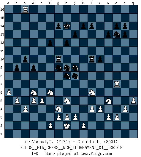 Last move : 1-0 2023 December 19 13:50:33 [Event "FICGS__BIG_CHESS__WCH_TOURNAMENT_01__000015"] [Site "FICGS"] [Date "2022.11.23"] [Round "1"] [White "de Vassal,Thibault"] [Black "Cirulis,Ilmars"] [Result "1-0"] [WhiteElo "2191"] [BlackElo "2001"] 1.j2-k4 m15-m13 2.h1-l4 j15-k13 3.h2-g4 d15-d13 4.m2-m4 h16-o10 5.e2-e4 g16-f14 6.p1-o3 n15-n13 7.l1-p5 c16-k9 8.b1-c3 e15-e13 9.f1-b5 l16-p12 10.k1-h2 p16-o14 11.d2-d3 b16-c14 12.c1-h6 o16-h10 13.n2-n3 p12-l8 14.l4-b13 a16-b16 15.o1-f9 m16-m14 16.g1-j2 o14-n12 17.m1-m3 q16-m16 18.m3-l3 o10-n10 19.l3-l5 n12-l11 20.e1-e3 e16-e14 21.e3-f3 a15-a14 22.b13-b9 a14-a13 23.b9-c10 f16-b12 24.h6-b12 a13-b12 25.q2-q4 f14-g12 26.c10-j4 g12-j11 27.f3-f6 e14-f14 28.f6-a6 f14-g14 29.k4-l6 k9-g12 30.a6-a10 l11-k9 31.j2-k4 c14-d12 32.a10-b10 c15-c13 33.g4-h6 n10-n11 34.h2-g4 d12-f11 35.b10-a10 k9-h8 36.f9-d7 j16-j15 37.p5-n7 k16-l14 38.j4-d9 m14-p14 39.l5-p5 f11-d12 40.p5-p14 g12-d9 41.n7-p9 h10-d6 42.e4-e5 q15-p14 43.p9-n11 m13-m12 44.n11-k8 d6-g9 45.k8-e13 b16-a16 46.o3-n5 a16-a10 47.d7-a10 d9-f11 48.p2-p4 m16-e16 49.e13-l7 e16-e7 50.l7-k6 h8-k7 51.k6-g9 g14-g9 52.h6-f5 e7-e9 53.f5-d6 g9-j9 54.c3-e4 e9-c9 55.a1-e1 j11-h9 56.j1-h2 c9-c10 57.a10-b9 c10-c9 58.b9-e6 o15-o14 59.c2-c3 d12-e10 60.e1-e3 e10-f8 61.e6-c4 k13-h12 62.e3-f3 c9-c10 63.f3-f7 c10-k10 64.l6-n7 l8-j10 65.f7-c7 c13-c12 66.c7-a7 h15-g13 67.a7-a15 j10-c16 68.q1-m1 b15-b13 69.m1-m3 j9-n9 70.n7-o5 h12-j10 71.m3-l3 f11-d9 72.a15-a16 d9-g12 73.a16-a13 c16-d15 74.a13-a9 b12-b11 75.l3-l6 b11-b10 76.a9-a16 d15-c16 77.l6-q6 l14-n15 78.q6-q16 c16-d15 79.q16-j16 j15-k14 80.j16-n16 n15-o13 81.n16-k16 n9-k9 82.a16-g16 g15-g14 83.b5-n16 o13-n15 84.n16-o15 g12-h11 85.c4-b5 h11-b5 86.d6-b5 d15-h11 87.b5-d6 b13-b12 88.g16-g15 k14-j13 89.o15-n16 l15-l14 90.k16-m16 j10-l11 91.n16-o15 d13-d12 92.m16-n16 l11-m13 93.n16-a16 h11-f9 94.o15-n14 m13-o12 95.n14-l12 m12-m11 96.l12-o15 h14-h13 97.g15-g16 n15-o13 98.g16-d16 k10-k12 99.o15-j10 k9-j9 100.j10-n6 d12-d11 101.a16-a13 g13-f11 102.d16-d15 k12-f12 103.a13-a15 f11-g13 104.d15-d13 j13-h14 105.a15-d15 g13-f11 106.d15-a15 o12-n10 107.a2-a4 n10-l9 108.a4-a5 o13-n11 109.b2-b4 d11-d10 110.d13-d15 h14-g15 111.d15-c15 c12-c11 112.a15-a12 f11-h10 113.n6-l4 j9-j12 114.l4-f9 h10-f9 115.e4-f6 f9-h8 116.d3-d4 d10-d9 117.g2-g3 l9-j8 118.a12-a7 j12-g12 119.c15-c16 g12-g11 120.c16-b16 g11-k11 121.a7-a12 k11-k12 122.a12-a16 k7-j9 123.b16-g16 g15-h15 124.g16-h16 h15-j15 125.h16-p16 n11-o13 126.a16-h16 f15-f13 127.p16-j16 j15-k14 128.h16-g16 f12-g12 129.j16-m16 h9-k10 130.g16-g15 k14-j13 131.m16-k16 o13-m14 132.k16-m16 m14-o13 133.m16-m15 k15-k14 134.g15-g16 f8-h9 135.m15-h15 k10-h11 136.o5-n7 k12-q12 137.q4-q5 q12-q10 138.n7-l6 q10-c10 139.c3-c4 c10-j10 140.b4-b5 j10-o10 141.o2-o3 o10-j10 142.g16-d16 c11-c10 143.h15-c15 m11-m10 144.d16-c16 g12-g10 145.c15-c12 b12-b11 146.c12-c11 b10-b9 147.c11-b11 h9-f8 148.b11-e11 f13-f12 149.e11-e14 j10-h10 150.c16-c14 j13-h14 151.e14-e13 p14-p13 152.d4-d5 j14-j13 153.a5-a6 f8-h9 154.k4-h5 h10-l10 155.l2-l4 h13-h12 156.e13-e7 h11-g9 157.e7-o7 p15-p14 158.c14-c16 1-0 Comment by player 1 : Thibault de Vassal : Thanks for the game Ilmars! Was a tough battle... It could have lasted a few years yet ;) Ilmars Cirulis Thank you too! :) Yes, Big Chess means long games. I just wasn't in the mood to prolong it into these few years. :D Yeturu Aahlad With my opponent's permission, I will play an obviously lost game until there is nothing more I can learn. Follow this game move after move (download)A big shock; the best chess player in history has passed away. (Lajos Portisch, about Bobby Fischer's death) Ich bin es gewohnt, das die Jugend mir überhaupt keinen Respekt entgegenbringt. (Alexander Morozewich) El tablero es el mundo, las piezas es el fenomeno del universo, las reglas del juego son lo que llamamos leyes de la naturaleza y el jugador del lado opuesto, se encuentra oculto a nuestra vista. (Thomas Huxley) La tactique, c'est ce que vous faites quand il y a quelque chose à faire; la stratégie, c'est ce que vous faites quand il n'y a rien à faire. (Savielli Tartacower) Every now and then a man's mind is stretched by a new idea and never shrinks back to its former dimensions. (Oliver Wendell Holmes, Sr.)