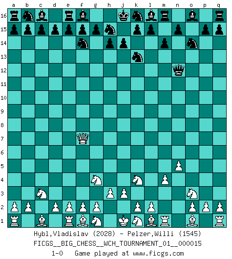 Last move : 1-0 2023 February 17 19:56:31 [Event "FICGS__BIG_CHESS__WCH_TOURNAMENT_01__000015"] [Site "FICGS"] [Date "2022.11.23"] [Round "1"] [White "Hybl,Vladislav"] [Black "Pelzer,Willi"] [Result "1-0"] [WhiteElo "2028"] [BlackElo "1545"] 1.m2-m4 j15-k13 2.p1-o3 h16-o10 3.h2-g4 o10-l10 4.j2-k4 l10-c2 5.h1-o7 c2-c12 6.o7-o15 p16-o14 7.o15-f7 g16-f14 8.n2-n4 c12-n12 9.n4-n5 m15-m14 10.b1-c3 1-0 This big chess game has been lost on time (started : 2022.11.23 16:47:0) Follow this game move after move (download)The stomach is an essential part of the Chess master. (Bent Larsen) Ein Schachgenie ist jemand der verdammt gut Schach spielt. (Jonathan Levitt) ¿Se han dado cuenta de que Fischer casi nunca ha tenido piezas malas? El las intercambia y las piezas malas se quedan con sus oponenets. (Yuri Balashov) C'est une question de caractère, Beaucoup de gens perdent leur motivation très vite. D'autres, ils sont rares, peuvent la conserver très longtemps. J'aime les échecs, encore aujourd'hui je suis heureux d'analyser des parties. J'aime toujours gagner, je déteste encore perdre. Bien jouer est important pour mon intégrité intellectuelle et morale. Et puis les échecs vivent en ce moment une période historique grâce à Internet. Ils se développent dans les systèmes éducatifs à travers le monde. Ils sortent de leur ghetto, et c'est mon rôle de mener à bien cette révolution. (Gary Kasparov) How many people work in NATO Headquarters ? - About half of them. (Dirk Stikker, NATO general secretary)