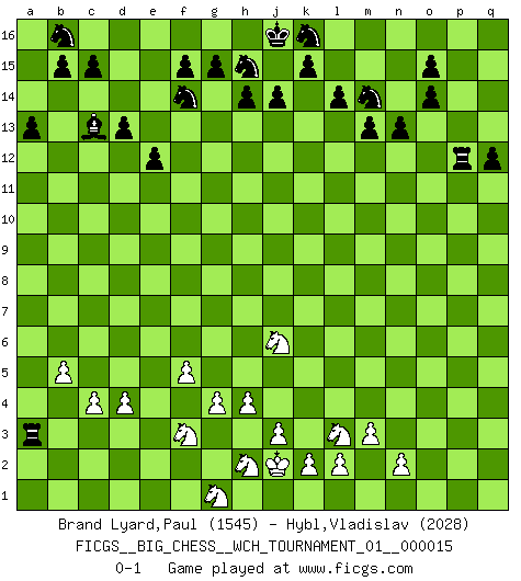 Last move : 0-1 2023 February 18 9:17:21 [Event "FICGS__BIG_CHESS__WCH_TOURNAMENT_01__000015"] [Site "FICGS"] [Date "2022.11.23"] [Round "1"] [White "Brand Lyard,Paul"] [Black "Hybl,Vladislav"] [Result "0-1"] [WhiteElo "1545"] [BlackElo "2028"] 1.j2-k4 p16-o14 2.d2-d3 e15-e13 3.e2-e4 j15-k13 4.o2-o3 e16-e14 5.e1-e3 h16-o10 6.g2-g3 n15-n13 7.e3-f3 e14-f14 8.f3-f14 g16-f14 9.c1-p13 o16-g9 10.g3-g4 o10-f10 11.h1-f3 f10-h10 12.p13-o14 p15-o14 13.f3-f13 g9-p1 14.q1-p1 h10-q2 15.m2-m3 q2-p1 16.k1-l3 p1-c13 17.c2-c3 e13-e12 18.f13-c13 f16-c13 19.h3-h4 d15-d13 20.d3-d4 m15-m13 21.p2-p3 c16-k9 22.f2-f3 q16-p16 23.p3-p4 p16-p11 24.o1-p2 a15-a13 25.a2-a3 a16-a14 26.f1-a6 a14-b14 27.b2-b4 m16-p16 28.p2-q3 p11-q11 29.m1-q1 b14-b6 30.a6-e10 k9-p4 31.o3-p4 b6-b10 32.e10-l4 b10-q10 33.j1-h1 q10-q3 34.q1-q3 q11-q3 35.l1-n3 q3-n3 36.h1-j2 p16-p4 37.b1-d2 p4-p1 38.f3-f4 n3-n11 39.d2-f3 l16-o13 40.b4-b5 o13-e4 41.a1-e1 n11-e11 42.e1-e4 e11-e4 43.f4-f5 e4-e3 44.c3-c4 e3-a3 45.k4-j6 q15-q13 46.l4-q9 l15-l14 47.q9-o11 q13-q12 48.o11-q13 k13-m14 49.q13-p12 p1-p12 0-1 Follow this game move after move (download)Bobby Fischer's current state of mind is indeed a tragedy. One of the world's greatest Chess players - the pride and sorrow of American Chess. (Frank Brady) Woher wissen wir, daß der Neanderthaler Blindschach gespielt hat? -- Bei Ausgrabungen wurden keine Schachbretter und Figuren gefunden. (Anonymous) Durante una competencia de Ajedrez, un Maestro de Ajedrez deberá ser una combinación de presa de caza y un Monge. (Alexander Alekhine) Nous vivons dans un monde échiquéen : chaque jour qui passe est un défi à relever. (Philosophe Sasha) I find your interest interesting. (Gregory House, House M.D.)