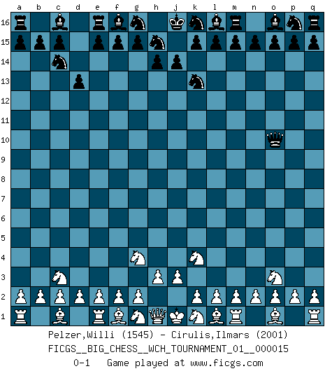 Last move : 0-1 2023 January 2 2:2:50 [Event "FICGS__BIG_CHESS__WCH_TOURNAMENT_01__000015"] [Site "FICGS"] [Date "2022.11.23"] [Round "1"] [White "Pelzer,Willi"] [Black "Cirulis,Ilmars"] [Result "0-1"] [WhiteElo "1545"] [BlackElo "2001"] 1.p1-o3 j15-k13 2.j2-k4 h16-o10 3.h2-g4 d15-d13 4.b1-c3 b16-c14 0-1 This big chess game has been lost on time (started : 2022.11.23 16:47:0) Follow this game move after move (download)If Chess is a science, it's a most inexact one. If Chess is an art, it is too exacting to be seen as one. If Chess is a sport, it's too esoteric. If Chess is a game, it's too demanding to be just a game. If Chess is a mistress, she's a demanding one. If Chess is a passion, it's a rewarding one. If Chess is life, it's a sad one. (Unknown) Es gibt zwei Arten von Opfern: Korrekte und meine. (Mikhail Nekhemyevich Tal) Los Peones son el alma de una partida de Ajedrez. (Francois Andre Danican Philidor) Une platitude souvent récitée à propos des Echecs est qu'une des choses les plus difficiles à réaliser est de gagner une position gagnante. Cela ne manque pas de sens mais, pour ma part, j'ai toujours trouvé plus difficile de gagner une position perdante. (Tim Krabbe) Patience, use the Force, think ! (Obi-Wan Kenobi in Star Wars ep.2)