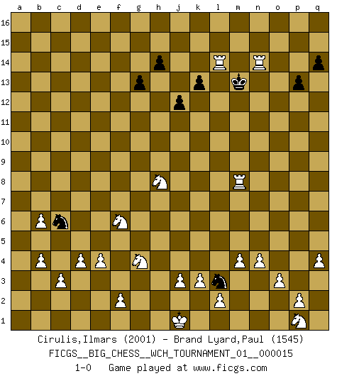 Last move : 1-0 2023 April 15 16:26:41 [Event "FICGS__BIG_CHESS__WCH_TOURNAMENT_01__000015"] [Site "FICGS"] [Date "2022.11.23"] [Round "1"] [White "Cirulis,Ilmars"] [Black "Brand Lyard,Paul"] [Result "1-0"] [WhiteElo "2001"] [BlackElo "1545"] 1.j2-k4 p16-o14 2.h2-g4 c15-c14 3.h1-l4 l15-l14 4.e2-e4 e15-e13 5.d2-d4 d15-d13 6.m2-m4 m15-m14 7.l4-l10 g15-g14 8.l10-f10 m16-m15 9.f1-c4 n15-n14 10.c1-l9 m14-m13 11.b1-c3 c16-n6 12.f10-f15 e16-e15 13.l9-e15 h16-g15 14.f15-g15 f16-g15 15.e15-p5 g15-f14 16.n2-n4 f14-p5 17.l1-p5 p15-p14 18.p5-k10 o16-p15 19.o1-h7 q16-p16 20.k10-j9 e13-e12 21.a2-a4 b16-a14 22.q2-q4 a16-f16 23.a1-a3 f16-f4 24.a3-b3 o14-q13 25.j9-p15 p16-p15 26.b3-b15 k15-k13 27.h7-a14 p14-p13 28.a14-j6 q13-o12 29.b15-a15 j14-j13 30.c4-g8 m15-k15 31.a15-a14 g16-e15 32.a14-a9 n14-n13 33.a9-n9 n6-m7 34.n9-n13 o15-o14 35.n13-n7 m7-p4 36.o2-o3 p4-k9 37.g8-f7 f4-f7 38.n7-f7 e15-f13 39.f7-c7 l16-o13 40.c7-c14 f13-g11 41.c14-d14 p15-n15 42.d14-d16 h15-f16 43.d16-f16 j16-h15 44.f16-f15 h15-g16 45.f15-f8 n15-n6 46.f8-d8 n6-j6 47.k4-j6 k16-j14 48.d8-d13 j14-g13 49.d13-d8 g16-h15 50.j6-h8 k9-h7 51.a4-a5 g11-e10 52.d8-d9 k15-k16 53.g1-f3 k16-b16 54.f3-g5 h7-l4 55.e1-b1 b16-a16 56.b2-b4 a16-a6 57.b1-e1 e10-f8 58.d9-d8 f8-e10 59.d8-b8 g13-f11 60.k2-k3 l4-n6 61.b8-b6 a6-b6 62.a5-b6 e10-d8 63.c3-d5 d8-c6 64.c2-c3 o12-n10 65.e1-a1 h15-j14 66.a1-a12 e12-e11 67.a12-e12 j15-h13 68.e12-e11 f11-g9 69.m1-m3 o13-h7 70.g5-h7 g9-h7 71.e11-o11 h7-g5 72.o11-o14 j14-k14 73.d5-f6 h13-g11 74.m3-l3 n10-m12 75.l3-l6 n6-m7 76.l6-m6 g5-h3 77.g2-h3 m7-h3 78.m6-m12 h3-k1 79.j1-k1 g11-h9 80.m12-m13 h9-j7 81.m13-m14 k14-l13 82.m14-l14 l13-m13 83.o14-n14 j7-k5 84.q1-q3 k5-l3 85.k1-j1 g14-g13 86.q3-p3 j13-j12 87.p3-p8 q15-q14 88.p8-m8 1-0 Follow this game move after move (download)Many Chess players were surprised when after the game, Fischer quietly explained: 'I had already analyzed this possibility' in a position which I thought was not possible to foresee from the opening. (Mikhail Tal) Matt entspricht nicht immer den Tatsachen. (Savielly Grigorievitsch Tartakower) El tablero es el mundo, las piezas es el fenomeno del universo, las reglas del juego son lo que llamamos leyes de la naturaleza y el jugador del lado opuesto, se encuentra oculto a nuestra vista. (Thomas Huxley) Dieu déplace le joueur, et celui-ci la pièce. Quel Dieu derrière Dieu commence donc la trame ? Arturo Perez-Reverte (prix de littérature policière 1993). The intuitive mind is a sacred gift; the rational mind is a faithful servant. We have created a society that honors the servant but has forgotten the gift. (Albert Einstein)