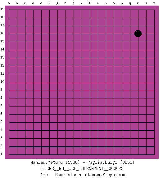 Last move : 1-0 2023 February 16 4:33:30 [Event "FICGS__GO__WCH_TOURNAMENT__000022"] [Site "FICGS"] [Date "2023.01.04"] [Round "1"] [Black "Aahlad,Yeturu"] [White "Paglia,Luigi"] [Result "1-0"] [Rating 1 "1988"] [Rating 2 "0255"] 1.r16 1-0 This go game has been lost on time (started : 2023.01.04 4:0:32) Follow this game move after move (download)Extend one hand from the cutting points. (Anonymous) A journey of a thousand sites begins with a single click. (Author unknown)