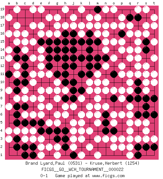 Last move : 0-1 2022 December 17 8:40:38 [Event "FICGS__GO__WCH_TOURNAMENT__000022"] [Site "FICGS"] [Date "2022.11.25"] [Round "1"] [Black "Brand Lyard,Paul"] [White "Kruse,Herbert"] [Result "0-1"] [Rating 1 "0531"] [Rating 2 "1254"] 1.g3 c4 2.j8 q4 3.k13 r16 4.e10 c16 5.m10 e3 6.s18 q17 7.p16 p17 8.f13 e17 9.d18 g17 10.h16 r13 11.f10 n3 12.n13 g16 13.d14 b15 14.p7 r5 15.r6 q6 16.h10 q7 17.q8 p8 18.o8 p9 19.f6 o9 20.o10 n9 21.o7 q11 22.l15 c6 23.r4 r3 24.r2 p3 25.g11 k4 26.k7 g5 27.r1 f5 28.p10 q10 29.r10 q9 30.r8 r11 31.o14 j5 32.k11 j17 33.c11 m7 34.l8 l6 35.h14 m17 36.l12 c14 37.f8 n16 38.r9 s4 39.o12 e6 40.h11 d13 41.e15 e16 42.f14 b12 43.j14 c9 44.l13 b11 45.h12 q14 46.k18 k17 47.j9 d11 48.g7 h17 49.h18 f2 50.m12 p15 51.j16 d8 52.m15 o15 53.m5 k6 54.p13 d15 55.j15 h6 56.k9 e12 57.n5 s12 58.n11 l17 59.n18 e7 60.k2 k3 61.j10 h7 62.g14 d10 63.h13 e9 64.c10 m8 65.f15 m9 66.n8 n15 67.g9 e8 68.j12 f7 69.g4 g6 70.c2 e2 71.c17 b17 72.t12 s17 73.s15 q13 74.o5 n14 75.n2 o2 76.e4 d4 77.q12 l9 78.f12 r12 79.o18 l10 80.l11 g8 81.p5 q5 82.h2 j3 83.m4 k16 84.l16 l18 85.l14 e14 86.o11 f9 87.t8 s9 88.n6 e11 89.b7 l7 90.k5 e13 91.b5 c3 92.l3 m3 93.l1 l4 94.f19 k8 95.h8 j7 96.s14 f18 97.f1 e1 98.t2 t3 99.c7 f16 100.c5 b4 101.p18 t18 102.b9 d6 103.r18 s19 104.g13 p14 105.j1 t11 106.s6 q2 107.b6 c8 108.c1 s5 109.r15 t17 110.b13 b8 111.n17 o13 112.n4 p12 113.p1 o3 114.h15 m16 115.b18 a18 116.s13 s11 117.h4 j4 118.s7 t10 119.m19 m18 120.m2 l2 121.d16 n10 122.b3 a4 123.c12 m11 124.j19 m10 125.t14 p2 126.f4 d3 127.o6 t13 128.o4 t15 129.p19 r19 130.p4 q3 131.d5 g2 132.q15 q16 133.l5 s3 134.b10 a9 135.t6 p6 136.c13 n7 137.d2 m6 138.n4 o17 139.k15 a13 140.l19 b16 141.n5 o5 142.e18 e19 143.g19 g18 144.b14 a14 145.m13 s16 146.n6 c15 147.l5 m5 148.q18 o6 149.e5 a3 150.r17 r14 151.q15 f11 152.q19 g10 153.s15 h9 154.s14 d17 155.o1 j2 156.n19 j18 157.b2 g9 158.c19 h19 159.s8 k19 160.a15 o19 161.c18 a16 162.a11 a7 163.o4 s10 164.n18 b19 165.h3 d19 166.n1 g1 167.s2 q1 168.q18 m1 169.r18 k1 170.m19 n19 171.o8 k5 172.d1 p11 173.g15 n12 174.o18 p18 175.o11 n17 176.j13 r15 0-1 Follow this game move after move (download)The carpenter's square becomes ko. (Anonymous) Depression is just anger without enthusiasm. (Unknown)