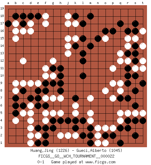 Last move : 0-1 2023 July 1 11:15:45 [Event "FICGS__GO__WCH_TOURNAMENT__000022"] [Site "FICGS"] [Date "2022.11.25"] [Round "1"] [Black "Huang,Jing"] [White "Gueci,Alberto"] [Result "0-1"] [Rating 1 "1226"] [Rating 2 "1045"] 1.q17 d4 2.r4 d16 3.f3 f17 4.c6 f4 5.g4 f5 6.e3 d3 7.d7 c5 8.b5 d6 9.b6 q4 10.r3 c9 11.e6 d5 12.e8 f7 13.c8 d9 14.e7 b4 15.f9 c12 16.f6 g5 17.h4 q5 18.p2 h7 19.h9 h5 20.j4 r15 21.p16 m5 22.m3 r12 23.r16 r5 24.r10 l3 25.l4 m4 26.k3 p11 27.r7 q9 28.r9 q8 29.q7 p3 30.o2 p7 31.s6 s5 32.p8 n3 33.l2 n2 34.q3 o8 35.s12 p9 36.r13 f11 37.g11 g12 38.h11 f10 39.h8 g10 40.h10 g7 41.g9 e9 42.f8 j13 43.l10 o3 44.s4 t5 45.t4 j17 46.l17 q12 47.s14 q13 48.l12 s15 49.s16 j15 50.c17 b15 51.e18 d17 52.d18 b17 53.b18 c16 54.c18 f18 55.a17 b16 56.k18 o15 57.o16 s11 58.r11 r14 59.s13 t11 60.s10 t14 61.s8 t12 62.t9 j18 63.k7 d2 64.e1 e2 65.f2 b8 66.b7 b9 67.n15 o1 68.q1 m7 69.k14 k15 70.l15 l14 71.m14 t16 72.s17 k17 73.m18 d1 74.l13 j14 75.f1 h2 76.g3 k5 77.m2 j2 78.k4 k2 79.m1 n1 80.s2 k6 0-1 This go game has been lost on time (started : 2022.11.25 1:52:0) Follow this game move after move (download)When your opponent is thick, you must also become thick. (Otake Hideo, 9p) Fame, I have already. Now I need the money. (an elderly Steinitz)
