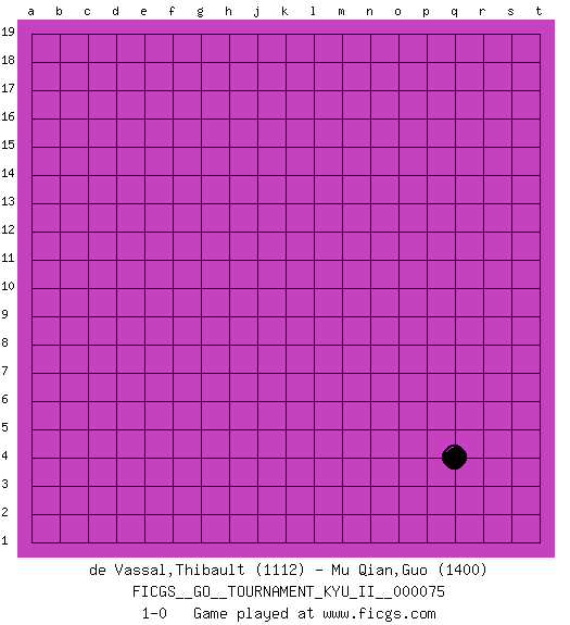 Last move : 1-0 2022 December 25 2:39:38 [Event "FICGS__GO__TOURNAMENT_KYU_II__000075"] [Site "FICGS"] [Date "2022.11.25"] [Round "1"] [Black "de Vassal,Thibault"] [White "Mu Qian,Guo"] [Result "1-0"] [Rating 1 "1112"] [Rating 2 "1400"] 1.q4 1-0 This go game has been lost on time (started : 2022.11.25 2:12:42) Follow this game move after move (download)Dead group ? Always win ko fights ! (Anonymous) Secret operations are essential in war; upon them the army relies to make its every move. (Sun Tzu)