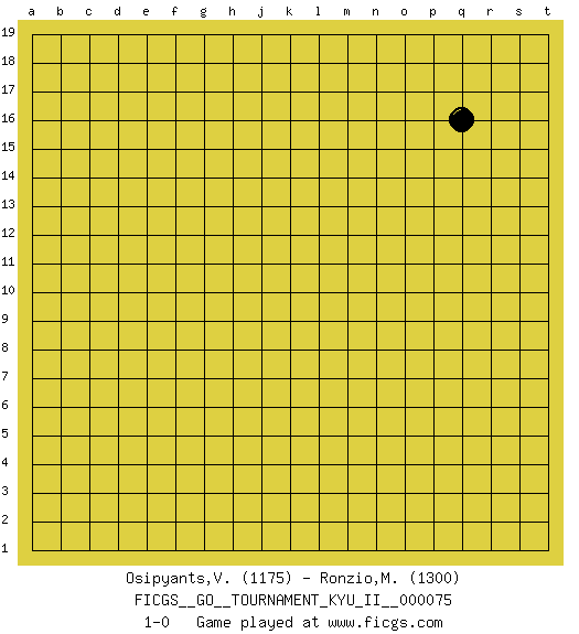 Last move : 1-0 2022 December 26 6:24:16 [Event "FICGS__GO__TOURNAMENT_KYU_II__000075"] [Site "FICGS"] [Date "2022.11.25"] [Round "1"] [Black "Osipyants,Vladimir"] [White "Ronzio,Massimo"] [Result "1-0"] [Rating 1 "1175"] [Rating 2 "1300"] 1.q16 1-0 This go game has been lost on time (started : 2022.11.25 2:12:42) Follow this game move after move (download)Don't overlook the edge of the board. (Anonymous) Yoga is 99% practice and 1% knowledge. (Sri Krishna Pattabhi Jois)