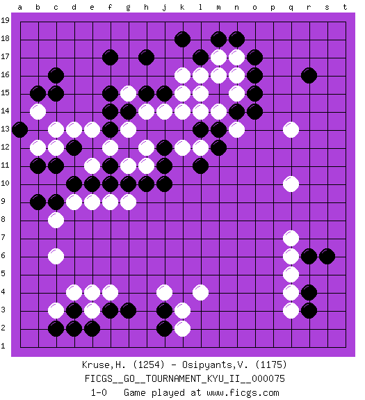 Last move : 1-0 2022 December 20 18:55:33 [Event "FICGS__GO__TOURNAMENT_KYU_II__000075"] [Site "FICGS"] [Date "2022.11.25"] [Round "1"] [Black "Kruse,Herbert"] [White "Osipyants,Vladimir"] [Result "1-0"] [Rating 1 "1254"] [Rating 2 "1175"] 1.c16 d4 2.r16 q4 3.f17 c6 4.o17 k16 5.r3 q3 6.r4 q5 7.s6 q7 8.j3 l4 9.f3 k3 10.d3 c3 11.c2 e3 12.d2 e4 13.e2 f4 14.g3 j4 15.c11 d9 16.e10 e11 17.d10 e9 18.f10 f9 19.g10 g9 20.h17 k14 21.j15 k15 22.j10 j14 23.g14 m17 24.l17 l16 25.r6 q6 26.j2 k2 27.o15 q10 28.k18 n16 29.m18 n17 30.n18 n15 31.o16 q13 32.n14 m14 33.m15 m16 34.m13 l15 35.l13 n13 36.o14 l14 37.j12 k12 38.l11 h12 39.j11 l12 40.m12 h14 41.h15 g13 42.f13 g15 43.f14 f12 44.f15 h11 45.h10 g11 46.f11 e13 47.c15 c13 48.c9 c8 49.b9 c12 50.d12 d13 51.b11 b14 52.b15 b12 53.a13 1-0 Follow this game move after move (download)Dead group ? Always win ko fights ! (Anonymous) It is not true that people stop pursuing dreams because they grow old, they grow old because they stop pursuing dreams. (Gabriel Garcia Marquez)