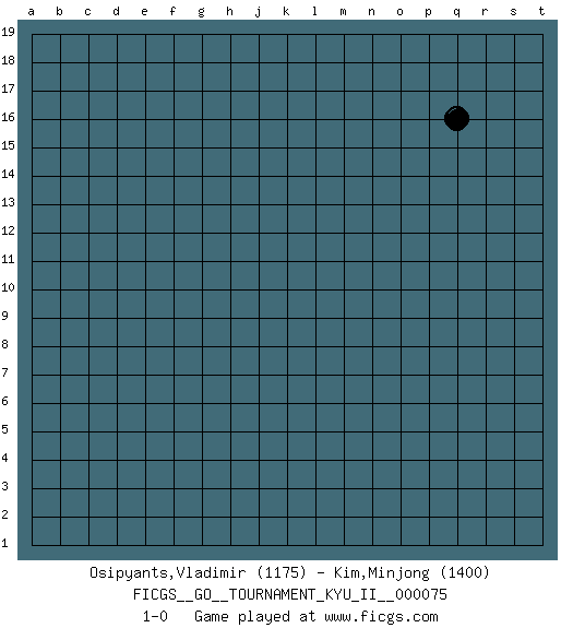 Last move : 1-0 2022 December 26 6:24:16 [Event "FICGS__GO__TOURNAMENT_KYU_II__000075"] [Site "FICGS"] [Date "2022.11.25"] [Round "1"] [Black "Osipyants,Vladimir"] [White "Kim,Minjong"] [Result "1-0"] [Rating 1 "1175"] [Rating 2 "1400"] 1.q16 1-0 This go game has been lost on time (started : 2022.11.25 2:12:42) Follow this game move after move (download)Strike at the waist of the knight's move. (Anonymous) Luck never made a man wise. (Seneca, Letters to Lucilius)