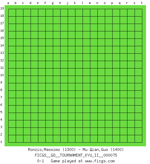 Last move : 0-1 2022 December 25 2:39:38 [Event "FICGS__GO__TOURNAMENT_KYU_II__000075"] [Site "FICGS"] [Date "2022.11.25"] [Round "1"] [Black "Ronzio,Massimo"] [White "Mu Qian,Guo"] [Result "0-1"] [Rating 1 "1300"] [Rating 2 "1400"] 0-1 This go game has been lost on time (started : 2022.11.25 2:12:42) Follow this game move after move (download)The enemy's vital point is your own. (Anonymous) Kids, you tried your best and you failed miserably. The lesson is, never try. (Simpsons)
