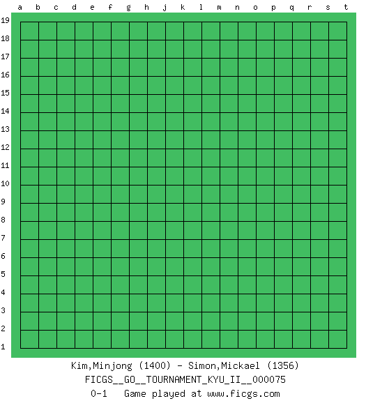 Last move : 0-1 2022 December 25 2:39:38 [Event "FICGS__GO__TOURNAMENT_KYU_II__000075"] [Site "FICGS"] [Date "2022.11.25"] [Round "1"] [Black "Kim,Minjong"] [White "Simon,Mickael"] [Result "0-1"] [Rating 1 "1400"] [Rating 2 "1356"] 0-1 This go game has been lost on time (started : 2022.11.25 2:12:42) Follow this game move after move (download)Learn the eye-stealing tesuji. (Anonymous) There will be no order, only chaos. (Sol Robeson in Pi by Darren Aronofsky)