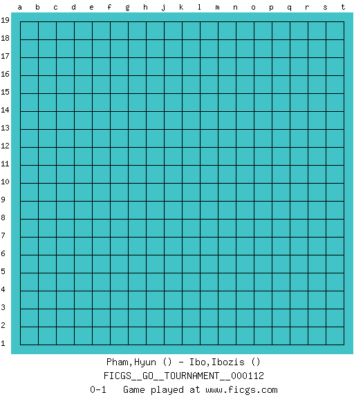Last move : 0-1 2022 December 25 16:30:8 [Event "FICGS__GO__TOURNAMENT__000112"] [Site "FICGS"] [Date "2022.11.25"] [Round "1"] [Black "Pham,Hyun"] [White "Ibo,Ibozis"] [Result "0-1"] 0-1 This go game has been lost on time (started : 2022.11.25 12:57:26) Follow this game move after move (download)There is no territory in the centre. (Anonymous) The beginning is the most important part of the work. (Plato)