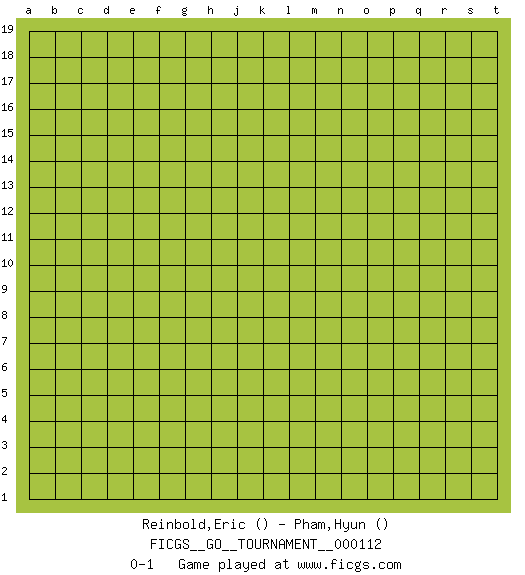 Last move : 0-1 2022 December 25 16:30:8 [Event "FICGS__GO__TOURNAMENT__000112"] [Site "FICGS"] [Date "2022.11.25"] [Round "1"] [Black "Reinbold,Eric"] [White "Pham,Hyun"] [Result "0-1"] 0-1 This go game has been lost on time (started : 2022.11.25 12:57:26) Follow this game move after move (download)If you cannot succeed, then die gloriously. (Chinese proverb) For to win one hundred victories in one hundred battles is not the acme of skill. To subdue the enemy without fighting is the acme of skill. (Sun Tzu)