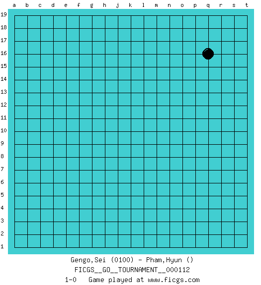 Last move : 1-0 2022 December 25 16:30:8 [Event "FICGS__GO__TOURNAMENT__000112"] [Site "FICGS"] [Date "2022.11.25"] [Round "1"] [Black "Gengo,Sei"] [White "Pham,Hyun"] [Result "1-0"] [Rating 1 "0100"] 1.q16 1-0 This go game has been lost on time (started : 2022.11.25 12:57:26) Follow this game move after move (download)If White takes all four corners, Black should resign; if Black takes all four corners, Black should also resign. (David Kent) Statistics can be made to prove anything - even the truth. (Author unknown)