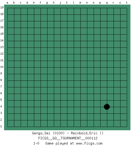 Last move : 1-0 2022 December 25 16:30:8 [Event "FICGS__GO__TOURNAMENT__000112"] [Site "FICGS"] [Date "2022.11.25"] [Round "1"] [Black "Gengo,Sei"] [White "Reinbold,Eric"] [Result "1-0"] [Rating 1 "0100"] 1.q4 1-0 This go game has been lost on time (started : 2022.11.25 12:57:26) Follow this game move after move (download)If your stone is capped, play the knight's move. (Anonymous) He who defends everything defends nothing. (Frederick the Great)