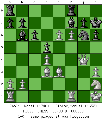 Last move : 1-0 2022 December 8 0:29:27 [Event "FICGS__CHESS__CLASS_D__000290"] [Site "FICGS"] [Date "2022.11.28"] [Round "1"] [White "Zmolil,Karel"] [Black "Pintor,Manuel"] [Result "1-0"] [WhiteElo "1740"] [BlackElo "1652"] 1.e4 e5 2.Nf3 Nc6 3.Bb5 Qf6 4.d3 h6 5.h3 Bc5 6.O-O Nge7 7.c3 O-O 8.Be3 Bb6 9.Nbd2 d6 10.Nc4 Qg6 11.Kh1 Qh5 12.Nh2 Na5 13.Qxh5 Nxc4 14.Bxc4 Be6 15.Bb5 Ng6 16.d4 exd4 17.cxd4 c6 18.Bd3 Ne7 19.f4 f5 20.e5 d5 21.g4 Bf7 22.Qh4 Ng6 23.Qg3 fxg4 24.Qxg4 Ne7 25.f5 Kh7 26.f6 Ng6 27.e6 1-0 Follow this game move after move (download)Chess is not like life... it has rules ! (Mark Pasternak) Capablanka war das größte Genie der Schachgeschichte! Aber denken sie nicht er habe nichts vom Schach verstanden. Er wusste nur soviel wie er wissen musste um seine Ziele zu erreichen. (Mikhail Moiseyevich Botvinik) Yo he agregado estos principios a la ley: pongan los Caballos en acción antes de que los dos Alfiles sean desarrollados. (Emanuel Lasker) Un footballeur joue avec ses pieds, parfois avec sa tête. Un joueur d'échecs ne joue qu'avec sa tête. Et quand il ne joue plus, il meurt. (Jacob Murray) Excelling at chess has long been considered a symbol of more general intelligence. That is an incorrect assumption in my view, as pleasant as it might be. But for the purposes of argument and investigation, chess is, in Russkin-Gutman's words, 'an unparalleled laboratory, since both the learning process and the degree of ability obtained can be objectified and quantified, providing an excellent comparative framework on which to use rigorous analytical techniques.' (The Chess Master and the Computer, by Garry Kasparov - 2010)