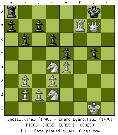 Last move : 1-0 2022 December 7 22:26:56 [Event "FICGS__CHESS__CLASS_D__000290"] [Site "FICGS"] [Date "2022.11.28"] [Round "1"] [White "Zmolil,Karel"] [Black "Brand Lyard,Paul"] [Result "1-0"] [WhiteElo "1740"] [BlackElo "1400"] 1.e4 e5 2.Nf3 Nc6 3.Bc4 Bc5 4.O-O d6 5.d3 h5 6.Ng5 Nh6 7.Qxh5 g6 8.Qh4 Qf6 9.Kh1 Nd4 10.Bb3 Nxb3 11.axb3 Ng4 12.Qg3 Bxf2 13.h3 Qg7 14.Rxf2 Nxf2+ 15.Qxf2 f6 16.Nf3 Bxh3 17.gxh3 Rxh3+ 18.Kg1 Qh8 19.Qg2 Kf7 20.Be3 Qh5 21.Nbd2 Rh1+ 22.Qxh1 Qg4+ 23.Qg2 Qh4 24.Nxh4 g5 25.Nf5 b6 26.Qh3 Ke6 27.Nd4+ Ke7 28.Qe6+ Kf8 29.Bxg5 fxg5 30.Rf1+ Kg7 31.Rf7+ Kh8 32.Qf6+ Kg8 33.Qg7+ 1-0 Follow this game move after move (download)Chess is a more highly symbolic game, but the aggressions are therefore even more frankly represented in the play. It probably began as a war game; that is, the representation of a miniature battle between the forces of two kingdoms. (Karl Meninger) Vielleicht wirkt die Aura früherer Spieler glanzvoller als die der heutigen Spieler, aber das liegt daran, dass man kein Programm wie Fritz hatte, das einem all die Löcher in ihren Partien zeigt. (Vladimir Kramnik) Después de una mala apertura, hay una esperanza en el juego medio. Pero una vez que estas en finales, el momento de la verdad ha llegado. (Edmar Mednis) Je fais ceci parce que dans cinquante coups j'obtiendrai cela; je m'appelle Mikhail Moisevitch Botvinnik. (Botvinnik) Watch your thoughts; they become words. Watch your words; they become actions. Watch your actions; they become habits. Watch your habits; they become character. Watch your character; it becomes your destiny. (Frank Outlaw)
