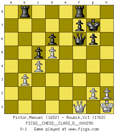 Last move : 0-1 2022 December 26 18:20:43 [Event "FICGS__CHESS__CLASS_D__000290"] [Site "FICGS"] [Date "2022.11.28"] [Round "1"] [White "Pintor,Manuel"] [Black "Roubik,Vit"] [Result "0-1"] [WhiteElo "1652"] [BlackElo "1763"] 1.e4 d6 2.f4 g6 3.Nf3 Bg7 4.Bc4 c5 5.O-O Nf6 6.Nc3 O-O 7.d3 Nc6 8.Nd5 Na5 9.Bb5 Nxd5 10.exd5 a6 11.Ba4 b5 12.Bb3 Qb6 13.c4 Rb8 14.Kh1 bxc4 15.Bxc4 Nxc4 16.dxc4 a5 17.Ng5 Qa6 18.b3 Bxa1 19.f5 Bxf5 20.Rxf5 h6 21.Rf3 hxg5 22.Bxg5 Bf6 23.Bxf6 exf6 24.Rxf6 a4 25.Qg4 Kg7 26.Qf3 axb3 27.axb3 Qa1+ 28.Qf1 Qxf6 0-1 Follow this game move after move (download)Though most people love to look at the games of the great attacking masters, some of the most successful players in history have been the quiet positional players. They slowly grind you down by taking away your space, tying up your pieces, and leaving you with virtually nothing to do ! (Yasser Seirawan) Ein Buch ist ein Spiegel; wenn ein Affe hineinsieht, so kann kein Apostel heraus gucken. (Georg Christoph Lichtenberg) Después de la respuesta de las negras a 1.e4 con 1..e5, se quedan siempre tratando de entrar dentro del juego. (Howard Staunton) Comme les marins qui ont mille raisons différentes d'aller en mer, les joueurs d'échecs en ont tout autant avant de s'installer devant une table et jouer... (Vincent Bertignac, philosophe) Art is not a thing, it is a way. (Elbert Hubbard)