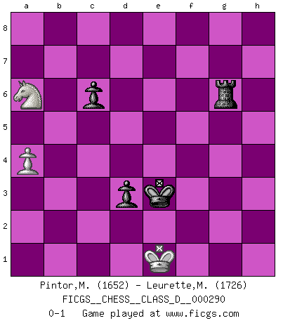 Last move : 0-1 2022 December 20 14:23:1 [Event "FICGS__CHESS__CLASS_D__000290"] [Site "FICGS"] [Date "2022.11.28"] [Round "1"] [White "Pintor,Manuel"] [Black "Leurette,Marc-Antoine"] [Result "0-1"] [WhiteElo "1652"] [BlackElo "1726"] 1.e4 e5 2.f4 d6 3.Nf3 exf4 4.Bc4 Be6 5.Bxe6 fxe6 6.d4 g5 7.O-O c6 8.e5 d5 9.h4 h6 10.Nh2 Ne7 11.Qh5+ Kd7 12.hxg5 Nf5 13.Bxf4 Bg7 14.Qf7+ Qe7 15.Qg6 Nxd4 16.Nc3 Nf5 17.Ng4 Nh4 18.Qh5 hxg5 19.Qxg5 Qxg5 20.Bxg5 Nf5 21.Nf6+ Kc7 22.Ne2 Nd7 23.Nf4 Nf8 24.c3 Bh6 25.Bxh6 Rxh6 26.N4h5 Nd7 27.Rf4 Nxe5 28.b3 Nd7 29.Nxd7 Kxd7 30.g4 Rg8 31.Kf2 Nd6 32.Kf3 Ne4 33.Rf7+ Kd6 34.Rf4 e5 35.Rf5 Nxc3 36.a4 Ne4 37.b4 Nd2+ 38.Kg3 Rhg6 39.Rf6+ Rxf6 40.Nxf6 Rg6 41.Nh5 e4 42.Kf4 Nf3 43.Ra2 Ne5 44.g5 Nf3 45.Rg2 a6 46.Nf6 Ke6 47.Ne8 Nxg5 48.Ke3 Kf5 49.Nc7 d4+ 50.Ke2 Kf4 51.b5 d3+ 52.Kd1 e3 53.bxa6 bxa6 54.Nxa6 e2+ 55.Rxe2 Nf3 56.Re1 Nxe1 57.Kxe1 Ke3 0-1 Follow this game move after move (download)By playing at Chess then, we may learn: First: Foresight... Second: Circumspection... Third: Caution... And lastly, we learn by Chess the habit of not being discouraged by present bad appearances in the state of our affairs, the habit of hoping for a favorable chance, and that of persevering in the secrets of resources. (Benjamin Franklin) Charakterschwächen offenbaren sich normalerweise während einer Schachpartie. (Garry Kasparov) La vida es como el Ajedrez, con lucha, competición y eventos buenos y malos. (Benjamin Franklin) Fischer est le meilleur joueur du monde et Karpov n'est qu'un joueur de bistrot. (Garry Kasparov, agé de 16 ans) Are you threatening me, Master Jedi ? (Chancellor Palpatine in Star Wars ep.3)
