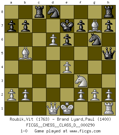 Last move : 1-0 2022 December 6 16:22:1 [Event "FICGS__CHESS__CLASS_D__000290"] [Site "FICGS"] [Date "2022.11.28"] [Round "1"] [White "Roubik,Vit"] [Black "Brand Lyard,Paul"] [Result "1-0"] [WhiteElo "1763"] [BlackElo "1400"] 1.d4 d5 2.c4 Qd7 3.cxd5 Qxd5 4.Nc3 Qa5 5.e4 e6 6.Nf3 Bb4 7.Bd2 Bxc3 8.Bxc3 Qh5 9.Rc1 Nc6 10.d5 Nd8 11.Bxg7 Ne7 12.Rxc7 Bd7 13.Rxd7 Rc8 14.Bb5 Ng6 15.Re7+ Kxe7 16.d6+ 1-0 Follow this game move after move (download)The older I grow, the more I value Pawns. (Keres) Ich brauche nur einen Blick auf das Schachbrett zu werfen, und weiß schon, was in der Stellung steckt, was geschehen kann und was geschehen wird. Alle übrigen suchen und prüfen, ich aber weiß es! (José Raúl Capablanca) Mis oponentes también hacen buenas movidas. A veces yo no tomo esas cosas en consideración. (Bobby Fischer) Vous n'êtes pas toujours obligé de jouer le meilleur coup. Un coup doit être actif, entreprenant, correct et beau ! (David Bronstein) Creativity is allowing yourself to make mistakes. Art is knowing which ones to keep. (Scott Adams)