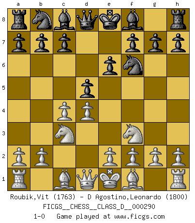 Last move : 1-0 2023 January 9 10:21:0 [Event "FICGS__CHESS__CLASS_D__000290"] [Site "FICGS"] [Date "2022.11.28"] [Round "1"] [White "Roubik,Vit"] [Black "D Agostino,Leonardo"] [Result "1-0"] [WhiteElo "1763"] [BlackElo "1800"] 1.d4 Nf6 2.c4 e6 3.Nc3 d5 4.Nf3 1-0 This chess game has been lost on time (started : 2022.11.28 18:14:45) Follow this game move after move (download)There must have been a time when men were demigods, or they could not have invented Chess. (Gustav Schenk) Habe Mut, dich deines eigenen Verstandes zu bedienen. (Immanuel Kant) ¿Que sería del Ajedrez sin errores graciosos?. (Kurt Richter) Vous m'avez demandé de vous exposer quel est le fondement de la prière. Je ne fais que préparer les pièces du jeu sur la table... Nous sera-t-il permis d'en adopter les règles et si nous les appliquons scrupuleusement nous ne tarderons pas à faire mat le Roi divin ! Il ne pourra échapper à nos mains. (Sainte Thérèse d'Avila, Chemin de perfection) The obstacle is the path. (Zen proverb)