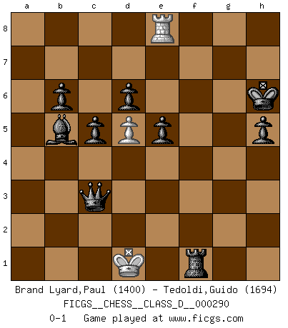 Last move : 0-1 2023 May 12 22:54:13 [Event "FICGS__CHESS__CLASS_D__000290"] [Site "FICGS"] [Date "2022.11.28"] [Round "1"] [White "Brand Lyard,Paul"] [Black "Tedoldi,Guido"] [Result "0-1"] [WhiteElo "1400"] [BlackElo "1694"] 1.e4 c5 2.Bc4 e6 3.d3 Nc6 4.Bb5 Nd4 5.c4 Nxb5 6.cxb5 d6 7.Nc3 h6 8.a4 b6 9.Nf3 Nf6 10.O-O Bb7 11.Re1 Be7 12.Be3 e5 13.Qc2 O-O 14.h4 Ng4 15.h5 Nf6 16.Bxh6 gxh6 17.Re3 Nxh5 18.g4 Nf4 19.Ra3 Bg5 20.Nxg5 Qxg5 21.Rg3 Rad8 22.b3 Bc8 23.Nd5 Nxd5 24.exd5 Kh8 25.Ra2 Rg8 26.Kf1 Qh4 27.Rg2 Rxg4 28.Rxg4 Bxg4 29.f3 Qh1+ 30.Ke2 Qxf3+ 31.Kd2 Qe2+ 32.Kc3 Qxc2+ 33.Rxc2 f5 34.Rh2 h5 35.Kd2 Kg7 36.Ke3 Kf6 37.Kf2 Kg5 38.Kg3 f4+ 39.Kf2 Kh6 40.Rh4 Bd1 41.Rh1 Bxb3 42.Ra1 Bc2 43.Ke2 Rf8 44.Kd2 Bb3 45.Rg1 Bxa4 46.Rb1 f3 47.Ra1 Bxb5 48.Rxa7 f2 49.Re7 f1Q 50.Re6+ Rf6 51.Re8 Qxd3+ 52.Kc1 Qc3+ 53.Kd1 Rf1+ 0-1 Follow this game move after move (download)If cunning alone were needed to excel, women would be the best Chess players. (Albin) Ich hatte Angst gegen einen russischen Großmeister zu verlieren, und er befürchtete gegen einen kleinen Jungen zu verlieren. (über ein Remis gegen Juri Awerbach). (Robert James Fischer) El Ajedrez es el gimnasio de la mente. (Blaise Pascal) La vie et les Echecs sont tous les deux une lutte constante. (Lasker) Internet: Absolute communication, absolute isolation. (Paul Carvel)