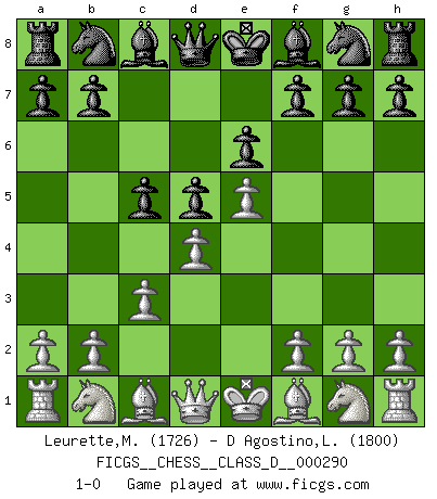 Last move : 1-0 2023 January 8 21:47:36 [Event "FICGS__CHESS__CLASS_D__000290"] [Site "FICGS"] [Date "2022.11.28"] [Round "1"] [White "Leurette,Marc-Antoine"] [Black "D Agostino,Leonardo"] [Result "1-0"] [WhiteElo "1726"] [BlackElo "1800"] 1.e4 e6 2.d4 d5 3.e5 c5 4.c3 1-0 This chess game has been lost on time (started : 2022.11.28 18:14:45) Follow this game move after move (download)The beauty of a move lies not in its' appearance but in the thought behind it. (Siegbert Tarrasch) Ich habe kein Problem mit Frauen, sondern nur mit dem Niveau ihres Schachspiels (Judith Polgar) El juego de Fischer siempre fue nítido, racional y brillante. Uno de los mejores por siempre. (Dave Regis) Donnez-moi un Cavalier en 6e et je gagnerais toutes mes parties. (Steinitz) A specialist learns more and more about less and less until he knows everything about nothing. (Nicholas Murray Butler)