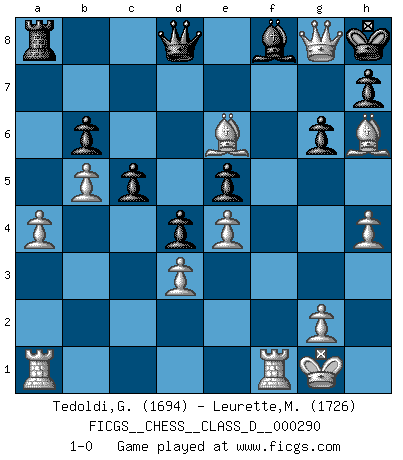 Last move : 1-0 2023 February 21 9:50:47 [Event "FICGS__CHESS__CLASS_D__000290"] [Site "FICGS"] [Date "2022.11.28"] [Round "1"] [White "Tedoldi,Guido"] [Black "Leurette,Marc-Antoine"] [Result "1-0"] [WhiteElo "1694"] [BlackElo "1726"] 1.c4 e5 2.Nc3 Nf6 3.d3 d6 4.h3 Nc6 5.e4 b6 6.Nf3 Bb7 7.Be3 Be7 8.Be2 O-O 9.O-O Nb4 10.a3 Na6 11.b4 c5 12.b5 Nc7 13.Nh2 a6 14.f4 axb5 15.Nxb5 Nxb5 16.cxb5 Ra5 17.a4 Bc8 18.f5 g6 19.Bh6 Re8 20.fxg6 fxg6 21.h4 d5 22.Ng4 Nxg4 23.Bxg4 d4 24.Qb3+ Kh8 25.Qf7 Rg8 26.Bxc8 Ra8 27.Be6 Bf8 28.Qxg8+ 1-0 Follow this game move after move (download)The tactician knows what to do when there is something to do; whereas the strategian knows what to do when there is nothing to do. (Gerald Abrahams) Der Bart als Geschlechtszeichen mitten im Gesicht ist obszön. Daher gefällt er den Weibern. [Zugegeben, kein Schachzitat, aber unglaublich originell] (Arthur Schopenhauer) Me dio la sensación de como si yo estuviera jugando en contra del mismo Ajedrez. - al estar jugando en contra de Robert Fischer (Walter Shipman) Les Echecs ont trois composantes : le temps, l'espace et le matériel en dernier. (Mikhail Tal) Wipe them out. All of them. (Darth Sidious in Star Wars ep.1)