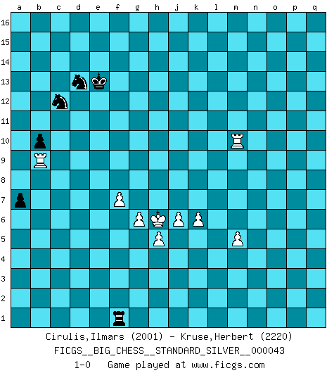 Last move : 1-0 2023 June 1 17:52:13 [Event "FICGS__BIG_CHESS__STANDARD_SILVER__000043"] [Site "FICGS"] [Date "2022.11.30"] [Round "2"] [White "Cirulis,Ilmars"] [Black "Kruse,Herbert"] [Result "1-0"] [WhiteElo "2001"] [BlackElo "2220"] 1.j2-k4 p16-o14 2.d2-d4 j15-k13 3.h1-o7 h15-g13 4.e2-e4 h16-m12 5.g1-f3 k16-h15 6.c1-j7 e15-e13 7.n2-n4 b16-c14 8.o1-h7 f16-b12 9.b1-c3 d15-d14 10.m2-m4 m15-m13 11.p1-o3 l16-p12 12.l1-p5 c16-l8 13.f1-e2 p12-m9 14.o7-l7 m16-m14 15.f3-g5 m14-l14 16.p5-l9 l8-e2 17.c3-e2 m12-p12 18.k4-j6 p12-p2 19.k1-m2 p2-p8 20.q1-p1 p8-l8 21.l7-l8 m9-l8 22.p1-p8 l8-n10 23.p8-b8 n15-n14 24.m1-p1 a15-a13 25.p1-p10 n10-o11 26.p10-p9 o11-n12 27.j1-j2 n12-h7 28.g5-h7 q15-q13 29.e1-p1 l14-l12 30.p1-p8 l12-p12 31.a1-p1 o16-l13 32.p9-o9 e16-e14 33.m2-k3 e14-f14 34.e2-f4 f14-f12 35.k3-j5 p12-p8 36.b8-p8 f12-p12 37.f4-g6 a16-e16 38.p8-j8 p12-p1 39.o3-p1 k13-m14 40.p1-o3 m14-o13 41.l9-k8 e16-e14 42.o9-l9 l13-k14 43.o3-n5 g16-j15 44.n5-l6 e14-f14 45.f2-f4 o14-n12 46.g6-h8 b12-c13 47.l9-h9 f14-f11 48.h7-g9 f11-a11 49.a2-a3 a11-c11 50.c2-c3 c11-b11 51.b2-b4 b11-a11 52.a3-a4 a11-a4 53.f4-f5 a4-a2 54.g2-g4 a2-a9 55.h8-j10 k14-f10 56.j5-h7 g13-f11 57.j7-h8 f11-g9 58.j10-g9 h15-g13 59.l6-j7 q16-m16 60.d4-d5 m16-m14 61.l2-l3 m14-l14 62.h2-j4 l14-l10 63.j4-h6 l10-g10 64.h6-f7 g10-o10 65.k8-p3 o10-n10 66.o2-o3 n10-o10 67.o3-o4 o10-n10 68.j7-g8 f10-d12 69.n4-n5 a9-a2 70.j2-k3 a2-e2 71.h7-g5 n10-a10 72.g8-h6 a10-a2 73.h6-j4 a2-a8 74.p3-q4 d12-e11 75.q4-l9 e2-e1 76.o4-o5 e1-o1 77.o5-o6 o1-q1 78.j8-q8 g13-f11 79.g9-f11 e11-h8 80.f7-h8 a8-c8 81.q8-q13 c8-c3 82.f11-g13 o13-q14 83.g13-f15 c3-c4 84.f15-h14 g15-h14 85.h9-h14 c13-e11 86.h14-h11 e11-g9 87.b4-b5 j15-h13 88.q13-q8 g9-l13 89.q8-j8 j16-h15 90.l9-k10 o15-o14 91.h11-q11 c4-b4 92.q11-b11 c14-b12 93.b11-f11 h15-g15 94.j8-j7 h13-f12 95.k10-d16 b12-d13 96.f11-b11 b15-b14 97.j7-q7 q1-b1 98.q7-b7 q14-o13 99.d16-h12 k15-k14 100.b5-b6 j14-j13 101.h12-c7 b1-q1 102.b11-q11 n12-o10 103.q11-q7 b4-b1 104.b7-b9 b1-p1 105.b9-h9 f12-g14 106.c7-b8 l13-m14 107.b8-k16 p1-p2 108.q7-l7 l15-l13 109.k16-m14 o13-m14 110.l7-d7 d13-e15 111.h9-c9 c15-c14 112.d7-d14 p2-q2 113.c9-b9 b14-b13 114.b9-n9 o10-n12 115.n9-a9 a13-a12 116.d14-d9 q2-q11 117.d9-g9 q11-k11 118.k3-j2 q1-b1 119.a9-e9 g15-f14 120.g9-g6 b1-b2 121.j4-h2 k11-b11 122.e9-e6 g14-f12 123.g5-h7 b11-a11 124.h7-k6 n12-m10 125.g6-h6 m10-l12 126.o6-o7 m14-k13 127.n5-n6 k13-h12 128.m4-m5 l12-k10 129.n6-n7 k10-j8 130.k6-j8 a11-a2 131.k2-k4 b2-h2 132.j2-k3 h2-k2 133.k3-l4 a2-j2 134.j3-j4 j2-j3 135.e6-e9 k2-k3 136.h3-h4 k3-l3 137.l4-k5 l3-p3 138.o7-o8 p3-p5 139.j6-l7 j3-n3 140.n7-n8 n3-n4 141.k5-j5 p5-p11 142.g4-g5 p11-k11 143.k4-k5 n4-p4 144.b6-b7 k11-j11 145.e9-n9 n14-n13 146.n9-k9 k14-k13 147.o8-o9 p4-p7 148.k9-k8 p7-l7 149.h8-k9 l7-k7 150.k8-k7 j11-j8 151.h6-j6 j8-n8 152.j6-j13 f12-g14 153.j13-j9 n8-e8 154.k9-l11 e8-e4 155.l11-k13 e4-e5 156.k13-h12 g14-h12 157.k7-f7 f14-g14 158.d5-d6 e5-e11 159.f7-p7 p15-p13 160.j9-j13 e11-o11 161.j13-l13 o11-o9 162.l13-e13 h12-f13 163.e13-e7 o9-d9 164.e7-e14 g14-f15 165.e14-o14 d9-d6 166.p7-p13 d6-d7 167.p13-n13 d7-b7 168.n13-m13 b7-j7 169.j5-k4 j7-h7 170.k4-j3 h7-q7 171.h4-h5 q7-q1 172.j3-h4 q1-h1 173.h4-j5 h1-g1 174.m13-g13 a12-a11 175.g13-g8 b13-b12 176.o14-o12 e15-d13 177.f5-f6 c14-c13 178.o12-c12 g1-m1 179.c12-c13 f13-e11 180.g8-m8 f15-e14 181.c13-c9 e14-e13 182.g5-g6 m1-f1 183.f6-f7 b12-b11 184.j5-h6 b11-b10 185.c9-h9 a11-a10 186.m8-m10 e11-c12 187.j4-j5 a10-a9 188.k5-k6 a9-a8 189.j5-j6 a8-a7 190.h9-b9 1-0 Follow this game move after move (download)Chess is in its essence a game, in its form an art, and in its execution a science. (Baron Tassilo) Gewinnen beim Schach fördert das Selbstvertrauen. Beim Sex spüre ich sowas nicht... (Garry Kasparov) Muchos se han convertido en Maestros de Ajedrez, nadie se ha convertido en el Maestro del Ajedrez. (Siegbert Tarrasch) Les échecs sont plus proches de l'art de l'assassinat que de l'art de la guerre. (Arturo Perez-Reverte) Experiences are the keys to life. (Daniel Parmet)