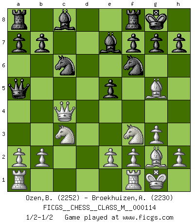 Last move : 1/2-1/2 2022 December 14 16:32:8 [Event "FICGS__CHESS__CLASS_M__000114"] [Site "FICGS"] [Date "2022.11.30"] [Round "1"] [White "Ozen,Bahadir"] [Black "Broekhuizen,A. T. S."] [Result "1/2-1/2"] [WhiteElo "2252"] [BlackElo "2230"] 1.Nf3 Nf6 2.g3 c5 3.c4 d5 4.d4 dxc4 5.Qa4+ Nc6 6.dxc5 e6 7.Bg2 Bxc5 8.Nc3 Qa5 9.Qxc4 O-O 10.O-O e5 11.Bg5 Be7 1/2-1/2 Follow this game move after move (download)The only thing Chess players have in common is Chess. (Lodewijk Prins) Garry Kasparov war erst in der Großmeister-Organisation GMA, dann in der Profischach-Vereinigung PCA, zum Schluss kehrte er wieder in den Schoß der FIDE zurück. Aber gut, manche Leute sind flexibel (Viswanathan Anand) Ciertamente, de todas la drogas del mundo, el Ajedrez debe ser el mas placentero permamentemente. (Assiac) Soyez une menace à chaque fois que vous vous asseyez pour jouer. (Ken Smith) Life is verb, not a noun. (Charlotte Perkins Gilman)