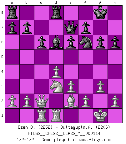 Last move : 1/2-1/2 2022 December 26 17:31:58 [Event "FICGS__CHESS__CLASS_M__000114"] [Site "FICGS"] [Date "2022.11.30"] [Round "1"] [White "Ozen,Bahadir"] [Black "Duttagupta,Aniruddha"] [Result "1/2-1/2"] [WhiteElo "2252"] [BlackElo "2206"] 1.Nf3 d5 2.d4 Nf6 3.c4 c6 4.Nc3 e6 5.Bg5 h6 6.Bxf6 Qxf6 7.e3 Nd7 8.Be2 dxc4 9.O-O Bd6 10.Nd2 Bc7 11.Nxc4 Qe7 12.Rc1 O-O 13.Qc2 Rd8 14.Rfd1 Nf6 15.Ne5 Bd7 16.Nxd7 Qxd7 17.Na4 Qe7 18.Nc5 Bd6 19.Nd3 g6 20.g3 1/2-1/2 Follow this game move after move (download)The stomach is an essential part of the Chess master. (Bent Larsen) Wenn Du absolut nicht mehr weißt, was Du tun sollst, dann ist es Zeit für Panik. (John van der Wiel) La enorme capacidad mental, en la que sin ella no puede un jugador de Ajedrez existir, es demasiado requerida por el Ajedrez al grado de que nunca podrá liberar su mente de este juego. (Albert Einstein) Horreur, mais aussi harmonie suprême : qu'y avait-il en effet au monde en dehors des échecs ? Le brouillard, l'inconnu, le non-être... (Vladimir Nabokov) Employ the attack like tactic of defense. (Chinese proverb)