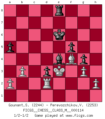 Last move : 1/2-1/2 2022 December 13 20:26:45 [Event "FICGS__CHESS__CLASS_M__000114"] [Site "FICGS"] [Date "2022.11.30"] [Round "1"] [White "Gounant,Stanislas"] [Black "Perevozchikov,Vjacheslav"] [Result "1/2-1/2"] [WhiteElo "2244"] [BlackElo "2253"] 1.c4 e5 2.g3 Nf6 3.Bg2 c6 4.Nf3 e4 5.Nd4 Qb6 6.e3 d5 7.Nc3 Bg4 8.Qa4 Bc5 9.Nxd5 Nxd5 10.cxd5 Bxd4 11.O-O O-O 12.Qxd4 Qxd4 13.exd4 cxd5 14.d3 exd3 15.Bxd5 Nc6 16.Bxc6 bxc6 17.f3 Bf5 18.Re1 Rfd8 19.Bd2 Rxd4 20.Rac1 Rd6 21.Bf4 Rd7 22.Rxc6 Be6 23.Rd1 h5 24.b3 Bf5 25.Rc5 g6 26.Rc7 Rxc7 27.Bxc7 g5 28.Ba5 g4 29.fxg4 hxg4 30.Bd2 Re8 31.Rf1 Be4 32.Re1 f5 33.Bf4 Kf7 34.Rd1 Kf6 35.Kf2 a5 36.Rd2 Ke6 37.Ke3 1/2-1/2 Follow this game move after move (download)A bad day of Chess is better than any good day at work. (Anonymous) Wenn Du nicht kämpfst, um anderen etwas zu beweisen, sondern nur für Dich selbst, dann bist du fast unbesiegbar. (Garry Kasparov) Si un gobernante no entiende al Ajedrez, ¿como puede governar él un reinado?. (El Rey Khusros II) La vie est comme un jeu d'échecs : nous esquissons un plan, mais celui-ci est tributaire de ce que daignent faire l'adversaire aux échecs et le destin dans la vie. (Arthur Schopenhauer) Being number two sucks. (Andre Agassi)