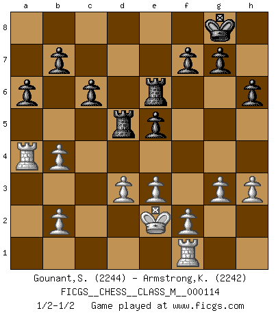 Last move : 1/2-1/2 2023 January 14 8:29:49 [Event "FICGS__CHESS__CLASS_M__000114"] [Site "FICGS"] [Date "2022.11.30"] [Round "1"] [White "Gounant,Stanislas"] [Black "Armstrong,Keith"] [Result "1/2-1/2"] [WhiteElo "2244"] [BlackElo "2242"] 1.c4 e5 2.g3 Nf6 3.Bg2 d5 4.cxd5 Nxd5 5.Nc3 Nb6 6.Nf3 Nc6 7.O-O Be7 8.d3 O-O 9.Be3 Re8 10.Rc1 Bf8 11.Ne4 h6 12.Nfd2 Nd4 13.Nb3 c6 14.Bd2 Nd5 15.Na5 Nb4 16.e3 Qxa5 17.a3 Nb5 18.Qb3 Bf5 19.h3 Nc7 20.Bxb4 Qb6 21.Qa4 Bxb4 22.axb4 Rad8 23.Ra1 Bxe4 24.Bxe4 a6 25.Qa5 Na8 26.Kg2 Qc7 27.Qxc7 Nxc7 28.Kf3 Nd5 29.Ra4 Re6 30.Bxd5 Rxd5 31.Ke2 1/2-1/2 Follow this game move after move (download)It is the aim of the modern school, not to treat every position according to one general law, but according to the principle inherent in the position. (Richard Reti) Korrekt heißt in Deutschland die Haltung eines Mannes, dessen Benehmen nach dem Urteile seiner Nachbarn seiner Stellung angemessen ist. Um korrekt zu sein, muß man sich der Meinung der anderen anpassen... (Emanuel Lasker) Fischer deseaba darle a los Rusos una sopa de su propia medicina. (Larry Evans) Il s'avisa de me proposer d'apprendre les échecs qu'il jouait un peu... me voilà forcené des échecs. J'achète un échiquier, je m'enferme dans ma chambre, j'y passe des jours et des nuits à vouloir apprendre par cur toutes les parties. (Jean-Jacques Rousseau, Confessions) SEO proverb : Make your website optimized for human beings, not for search engines.