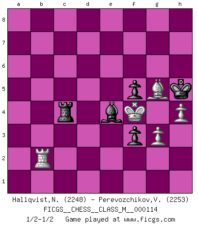 Last move : 1/2-1/2 2023 May 31 13:27:36 [Event "FICGS__CHESS__CLASS_M__000114"] [Site "FICGS"] [Date "2022.11.30"] [Round "1"] [White "Hallqvist,Niklas"] [Black "Perevozchikov,Vjacheslav"] [Result "1/2-1/2"] [WhiteElo "2248"] [BlackElo "2253"] 1.c4 e5 2.g3 c6 3.Bg2 d5 4.cxd5 cxd5 5.d4 e4 6.Nh3 Nc6 7.O-O h6 8.Nc3 Nf6 9.f3 Bb4 10.fxe4 dxe4 11.d5 Bxc3 12.dxc6 Bd4+ 13.e3 Bb6 14.Qxd8+ Kxd8 15.Nf2 Re8 16.cxb7 Bxb7 17.b4 a5 18.bxa5 Rxa5 19.Bd2 Ra3 20.Rab1 Re6 21.Rfd1 Ke8 22.Bh3 Rd6 23.Bc3 Rxd1+ 24.Nxd1 Nd5 25.Bxg7 Rxa2 26.Bg2 Bxe3+ 27.Nxe3 Nxe3 28.Bh3 Bd5 29.Bxh6 Nc4 30.Bg2 Ne5 31.Rd1 Bb7 32.Rb1 Bc6 33.Bg7 Nf3+ 34.Bxf3 exf3 35.Rb8+ Ke7 36.Bb2 f5 37.Rb6 Be4 38.Kf2 Ra4 39.h4 Rc4 40.Ba3+ Kf7 41.Rb2 Kg6 42.Be7 Rc1 43.Ke3 Kh5 44.Kf4 Rc4 45.Bg5 1/2-1/2 Follow this game move after move (download)Chess books should be used as we use glasses: to assist the sight, although some players make use of them as if they thought they conferred sight. (Jose Raul Capablanca) Was ist der Unterschied zwischen einem Strassenarbeiter und einem Schachspieler? --Der Schachspieler bewegt sich ab und zu. (Anonymous) Todo se encuentra en un estado de flujo y esto incluye al mundo del Ajedrez. (Mikhail Botvinnik) Un journaliste : 'Vous préférez avoir une dame de plus sur l'échiquier ou au lit ?' Boris Spassky : 'Ca dépend de la position.' Drag your thoughts away from your troubles... by the ears, by the heels, or any other way you can manage it. (Mark Twain)