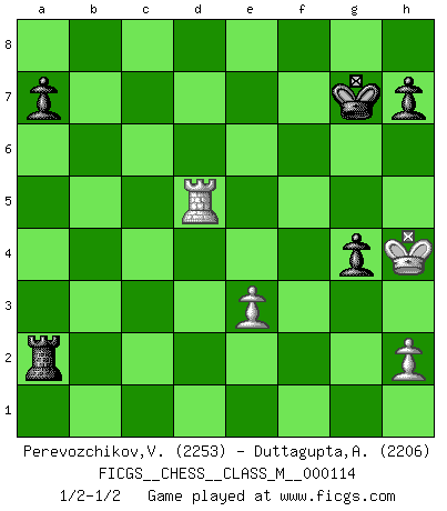 Last move : 1/2-1/2 2023 January 25 18:34:50 [Event "FICGS__CHESS__CLASS_M__000114"] [Site "FICGS"] [Date "2022.11.30"] [Round "1"] [White "Perevozchikov,Vjacheslav"] [Black "Duttagupta,Aniruddha"] [Result "1/2-1/2"] [WhiteElo "2253"] [BlackElo "2206"] 1.Nf3 d5 2.d4 Nf6 3.c4 e6 4.cxd5 exd5 5.Bf4 Be7 6.e3 Nh5 7.g3 Nxf4 8.gxf4 Nd7 9.Nc3 Nf6 10.Ne5 O-O 11.Bd3 c5 12.Qf3 cxd4 13.exd4 Bb4 14.O-O g6 15.Rfe1 Nh5 16.f5 Qh4 17.Re3 Qxd4 18.Nxd5 Bd6 19.Ng4 Kh8 20.Rd1 Qxb2 21.Be4 gxf5 22.Bxf5 Qg7 23.Re4 Bxf5 24.Qxf5 Rad8 25.Nde3 Qg6 26.Red4 Bc7 27.Rd7 Rxd7 28.Rxd7 Bf4 29.Rxb7 Rg8 30.Qxg6 Rxg6 31.Kf1 f5 32.Rb5 fxg4 33.Rxh5 Bxe3 34.fxe3 Ra6 35.Kf2 Rxa2+ 36.Kg3 Ra4 37.Rd5 Kg7 38.Kh4 Ra2 1/2-1/2 Follow this game move after move (download)Place the contents of the Chess box in a hat, shake them up vigorously, pour them on the board from a height of two feet, and you get the style of Steinitz. (H. E. Bird) Wenn du nicht weißt was du tun sollst, warte bis dein Gegner eine Idee hat. Sie wird sicher schlecht sein. (Siegbert Tarrasch) Un Peón pasado aumenta su poder a medida de que el número de piezas en el tablero disminuye. (Capablanca) Toutes les manuvres exécutées sur une colonne ouverte ont pour but ultime l'intrusion définitive sur la septième ou la huitième rangée, en plein cur de la position ennemie. (Aaron Nimzovitch) You can only get smarter by playing a smarter opponent. (Revolver, movie)