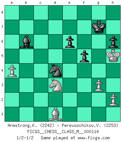 Last move : 1/2-1/2 2023 July 16 17:14:56 [Event "FICGS__CHESS__CLASS_M__000114"] [Site "FICGS"] [Date "2022.11.30"] [Round "1"] [White "Armstrong,Keith"] [Black "Perevozchikov,Vjacheslav"] [Result "1/2-1/2"] [WhiteElo "2242"] [BlackElo "2253"] 1.Nf3 d5 2.g3 c5 3.Bg2 Nc6 4.d4 e6 5.O-O Nf6 6.c4 dxc4 7.dxc5 Qxd1 8.Rxd1 Bxc5 9.Nbd2 c3 10.bxc3 O-O 11.Nb3 Be7 12.Bb2 Bd7 13.c4 Rfd8 14.Nfd4 Rac8 15.Nb5 b6 16.Nd6 Rc7 17.Ba3 Ne5 18.Nb5 Bxb5 19.Rxd8+ Bxd8 20.cxb5 Nc4 21.Rd1 Rd7 22.Rxd7 Nxd7 23.Bb4 Bc7 24.Nd4 Bd6 25.Be1 Na3 26.e3 Bc5 27.Nc6 Nxb5 28.a4 Na3 29.Nxa7 Nc2 30.Bc3 Bb4 31.Bc6 Bxc3 32.Bxd7 Ba5 33.Nc8 Na1 34.Kg2 Nb3 35.e4 g5 36.e5 g4 37.f3 gxf3+ 38.Kxf3 Bc3 39.Nxb6 Bxe5 40.Nc4 Bc7 41.Kg4 Kg7 42.Kh5 Nc5 43.Bc6 Nd3 44.Bb5 Ne5 45.Nd2 Bb6 46.Ne4 Bg1 47.Nc3 Bb6 48.Be2 Nc6 49.Bb5 Na5 50.Ne4 Be3 51.Bd3 h6 52.Bc2 Nc6 53.Bd1 Bg1 54.Nc3 Bd4 55.Ne2 Bb6 56.Nc3 Bd4 57.Ne2 Ba7 58.Nf4 Bb6 59.Bf3 Nd4 60.Bd1 f5 61.Nd3 1/2-1/2 Follow this game move after move (download)Nothing excites jaded Grandmasters more than a theoretical novelty. (Dominic Lawson) Schach ist das schnellste Spiel der Welt, weil man in jeder Sekunde Tausende von Gedanken ordnen muß. (Albert Einstein) Muchos se han convertido en Maestros de Ajedrez, nadie se ha convertido en el Maestro del Ajedrez. (Siegbert Tarrasch) Il n'y a pas de prix trop élevé au scalp de l'ennemi. (Koblentz) Creativity is allowing yourself to make mistakes. Art is knowing which ones to keep. (Scott Adams)