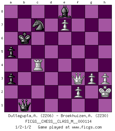 Last move : 1/2-1/2 2023 June 19 16:8:54 [Event "FICGS__CHESS__CLASS_M__000114"] [Site "FICGS"] [Date "2022.11.30"] [Round "1"] [White "Duttagupta,Aniruddha"] [Black "Broekhuizen,A. T. S."] [Result "1/2-1/2"] [WhiteElo "2206"] [BlackElo "2230"] 1.c4 c5 2.Nf3 Nf6 3.Nc3 d5 4.cxd5 Nxd5 5.e3 e6 6.Bc4 Be7 7.O-O O-O 8.d4 cxd4 9.exd4 Nxc3 10.bxc3 Qc7 11.Qe2 Nd7 12.Bd3 Qxc3 13.Rb1 Qc7 14.Bd2 Nf6 15.Rfc1 Qd8 16.Ne5 a5 17.a4 Ra7 18.Rc4 Ra8 19.Rb5 Nd5 20.Bxh7+ Kxh7 21.Rb3 Kg8 22.Rh3 f6 23.Ng6 Qb6 24.Rc1 Bd6 25.Rh8+ Kf7 26.Rh7 Rg8 27.Qh5 Ke8 28.Ne5 g6 29.Qh3 Be7 30.Nxg6 Rxg6 31.Qh5 Kd7 32.Qxg6 Qb2 33.Bh6 b5 34.Re1 bxa4 35.Bf8 Qd2 36.Qe4 Ra6 37.Bxe7 Nxe7 38.d5 Kd6 39.dxe6 Rb6 40.Rf1 Rb4 41.Qf3 Nd5 42.Qg3+ Rf4 43.e7 Bd7 44.h3 Be8 45.Rh8 Kd7 46.Qg7 Nc7 47.g3 Re4 48.Qxf6 Re1 49.Rxe1 Qxe1+ 50.Kh2 a3 51.Rh4 Kc8 52.Rc4 Kb7 53.Qf3+ Kb6 54.Re4 Qb1 55.Rc4 1/2-1/2 Follow this game move after move (download)It is always better to sacrifice your opponent's men. (Savielly Tartakower) Obwohl ich alt bin, darf mir niemand den Finger in den Mund stecken, sonst beisse ich. (Wilhelm Steinitz) El Ajedrez hace al hombre ser mas sabio y ver mas claro. (Vladimir Putin) On n'a jamais que l'âge auquel on a commence à jouer aux échecs car après on cesse de vieillir. (Capablanca) Crush them ! Make them suffer ! (General Grievous in Star Wars ep.3)