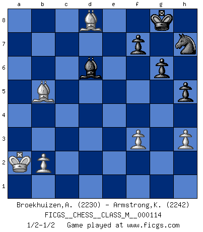 Last move : 1/2-1/2 2023 February 6 7:8:46 [Event "FICGS__CHESS__CLASS_M__000114"] [Site "FICGS"] [Date "2022.11.30"] [Round "1"] [White "Broekhuizen,A. T. S."] [Black "Armstrong,Keith"] [Result "1/2-1/2"] [WhiteElo "2230"] [BlackElo "2242"] 1.e4 c5 2.Nf3 d6 3.d4 cxd4 4.Nxd4 Nf6 5.Nc3 a6 6.Be3 e5 7.Nb3 Be6 8.f3 h5 9.Qd2 Nbd7 10.Nd5 Bxd5 11.exd5 g6 12.Be2 Bg7 13.O-O-O b5 14.Kb1 Nb6 15.Na5 Nbxd5 16.Bg5 O-O 17.Qxd5 Qxa5 18.Qxd6 Rad8 19.Bd2 Qxa2+ 20.Kxa2 Rxd6 21.Bb4 Rxd1 22.Rxd1 Ra8 23.Ba5 Bf8 24.c4 e4 25.Rd8 Rxd8 26.Bxd8 exf3 27.gxf3 Nh7 28.cxb5 axb5 29.Bxb5 Bd6 30.h3 1/2-1/2 Follow this game move after move (download)In order to improve your game, you must study the endgame before everything else, for whereas the endings can be studied and mastered by themselves, the middle game and the opening must be studied in relation to the endgame. (Jose Raul Capablanca) Über Frauen: Chess is better. (Robert James Fischer) Ciertamente, de todas la drogas del mundo, el Ajedrez debe ser el mas placentero permamentemente. (Assiac) Je ne crois pas en la psychologie, je crois aux bons coups. (Robert Fischer) I don't know, I don't care, and it doesn't make any difference. (Albert Einstein)