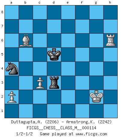 Last move : 1/2-1/2 2023 May 29 11:18:44 [Event "FICGS__CHESS__CLASS_M__000114"] [Site "FICGS"] [Date "2022.11.30"] [Round "1"] [White "Duttagupta,Aniruddha"] [Black "Armstrong,Keith"] [Result "1/2-1/2"] [WhiteElo "2206"] [BlackElo "2242"] 1.d4 Nf6 2.c4 e6 3.Nc3 Bb4 4.Qc2 O-O 5.e4 d5 6.e5 Ne4 7.Bd3 c5 8.Nf3 cxd4 9.Nxd4 Nd7 10.Bf4 Qh4 11.g3 Qh5 12.O-O g5 13.cxd5 Bxc3 14.bxc3 exd5 15.Be3 Nxe5 16.f3 Nc5 17.Bf5 f6 18.Kg2 Qf7 19.h4 gxh4 20.Rh1 Ng6 21.Rh2 Re8 22.Bf2 Re5 23.g4 Bxf5 24.gxf5 Nf4+ 25.Kh1 Kh8 26.Qd2 Nfd3 27.Bxh4 Rg8 28.Qh6 Nd7 29.Rd1 N3c5 30.Re2 Rxe2 31.Nxe2 Qg7 32.Qxg7+ Kxg7 33.Rxd5 Re8 34.Ng3 b6 35.Ne4 Re7 36.Nxc5 Nxc5 37.Rd6 Rd7 38.Rc6 Rd5 39.Bxf6+ Kf7 40.Bd4 Rxf5 41.Rc7+ Ke6 42.Rxa7 Rxf3 43.Rxh7 Kd5 44.Rh6 Na4 45.Kg2 Rd3 46.Bxb6 1/2-1/2 Follow this game move after move (download)There are tough players and nice guys, and I'm a tough player. (Bobby Fischer) Das typische an einem Großmeister ist, daß er eine gewonnene Position schnell und schmerzlos gewinnt. (Irving Chernev) Yo nunca en mi vida he jugado la Defensa Francesa, que viene siendo la más aburrida de todas las Aperturas. (Wilhelm Steinitz) Nous sommes les pions de la mystérieuse partie d'Echecs jouée par Dieu. Il nous déplace, nous arrête, nous pousse encore, puis nous lance un à un dans la boîte du Néant. Epitaphe sur la tombe de David Janowsky (1868-1927). I know the human being and fish can coexist peacefully. (George W. Bush, Saginaw sept. 29, 2000)