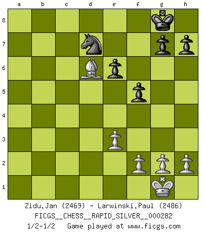 Last move : 1/2-1/2 2023 January 3 5:47:26 [Event "FICGS__CHESS__RAPID_SILVER__000282"] [Site "FICGS"] [Date "2022.12.01"] [Round "1"] [White "Zidu,Jan"] [Black "Larwinski,Paul"] [Result "1/2-1/2"] [WhiteElo "2469"] [BlackElo "2486"] 1.d4 d5 2.Nf3 Nf6 3.c4 dxc4 4.e3 e6 5.Bxc4 c5 6.O-O a6 7.b3 cxd4 8.Nxd4 Be7 9.Be2 O-O 10.Nd2 b5 11.Bb2 Bb7 12.Rc1 Qd7 13.N2f3 Bd6 14.a4 bxa4 15.bxa4 Rd8 16.Nd2 Nc6 17.Nc4 Bc7 18.Qb3 Rab8 19.Rfd1 Nxd4 20.Rxd4 Qe8 21.Rxd8 Qxd8 22.Qd3 Qxd3 23.Bxd3 Rc8 24.a5 Nd7 25.Rd1 Nc5 26.Be2 Rd8 27.Ba3 Rxd1+ 28.Bxd1 Nd7 29.Nd6 Ba8 30.Be2 Bxa5 31.Bxa6 Bb6 32.Bb7 Bxb7 33.Nxb7 Bc7 34.Nd6 Bxd6 35.Bxd6 f5 1/2-1/2 Follow this game move after move (download)A win by an unsound combination, however showy, fills me with artistic horror. (Wilhelm Steinitz) Ich trinke, ich rauche, ich spiele, ich liebe Frauen aber Fernschach ist ein Laster, das ich nicht habe. (Mikhail Nekhemyevich Tal) Cuando tengas duda... ¡juega al Ajedrez!. (Tevis) Je crois qu'il existe des manières très spécifiques de jouer efficacement contre une machine. Evidemment, nous n'avons aucune chance en technique pure, parce que l'ordinateur calcule de manière parfaite. Mais lorsque nous faisons appel à notre cerveau, en utilisant l'intuition et la compréhension, alors nous restons beaucoup plus forts. (Anatoli Karpov) Children in the dark cause accidents, accidents in the dark cause children. (Unknown)
