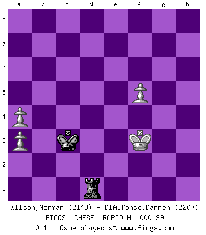 Last move : 0-1 2023 February 8 11:26:49 [Event "FICGS__CHESS__RAPID_M__000139"] [Site "FICGS"] [Date "2022.12.04"] [Round "1"] [White "Wilson,Norman"] [Black "DiAlfonso,Darren"] [Result "0-1"] [WhiteElo "2143"] [BlackElo "2207"] 1.d4 Nf6 2.c4 e6 3.Nf3 d5 4.Nc3 c6 5.Bg5 Nbd7 6.cxd5 exd5 7.e3 h6 8.Bh4 g5 9.Bg3 Nh5 10.Bd3 Nxg3 11.hxg3 Bg7 12.O-O Nb6 13.Qc2 O-O 14.Rab1 Re8 15.b3 Be6 16.Na4 Nxa4 17.bxa4 Re7 18.Bh7+ Kh8 19.Bf5 Bxf5 20.Qxf5 Kg8 21.Rfc1 Qa5 22.Qc2 Rc8 23.Ne1 Rec7 24.Nd3 Bf8 25.Kh2 Qa6 26.Nc5 Bxc5 27.dxc5 Qa5 28.a3 Rd7 29.Qf5 Qd8 30.Rh1 R8c7 31.Kg1 Kg7 32.Qe5+ f6 33.Qe6 Qh8 34.Qg4 Qh7 35.Qd1 Re7 36.Rb4 a6 37.Rh3 a5 38.Rd4 Re4 39.g4 Rce7 40.Qd2 Rxd4 41.exd4 Qb1+ 42.Kh2 Qe1 43.Qxe1 Rxe1 44.Rb3 Re7 45.f3 Kg6 46.Kg1 f5 47.gxf5+ Kxf5 48.g4+ Kf4 49.Kf2 h5 50.gxh5 Rh7 51.Kg2 Rxh5 52.Rxb7 Ke3 53.Rc7 Rh6 54.Rd7 Kxd4 55.Rd6 Rh8 56.Rxc6 Kc3 57.Ra6 d4 58.c6 Rc8 59.Rxa5 Rxc6 60.Rxg5 d3 61.Rd5 d2 62.f4 Re6 63.Kf3 Re1 64.f5 d1Q+ 65.Rxd1 Rxd1 0-1 Follow this game move after move (download)Personally, I rather look forward to a computer program winning the world Chess Championship. Humanity needs a lesson in humility. (Richard Dawkings) Zum Sieg gelangt man nicht, wenn man gut, sondern nur wenn man besser spielt (Savielly Grigorievitsch Tartakower) El Ajedrez, como cualquier otra actividad creativa, puede existir solo a través de méritos combinados de aquellos que tienen talento creativo y de aquellos que tienen la habilidad de organizar un trabajo creativo. (Mikhail Botvinnik) Votre seul travail dans les ouvertures est d'obtenir un milieu de partie jouable. (Lajos Portish) Creativity is inventing, experimenting, growing, taking risks, breaking rules, making mistakes, and having fun. (Mary Lou Cook)