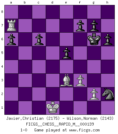 Last move : 1-0 2023 January 23 10:23:53 [Event "FICGS__CHESS__RAPID_M__000139"] [Site "FICGS"] [Date "2022.12.04"] [Round "1"] [White "Javier,Christian"] [Black "Wilson,Norman"] [Result "1-0"] [WhiteElo "2175"] [BlackElo "2143"] 1.e4 c5 2.Nf3 d6 3.d4 cxd4 4.Nxd4 Nf6 5.Nc3 Nc6 6.Bg5 e6 7.Qd2 a6 8.O-O-O h6 9.Nxc6 bxc6 10.Bf4 d5 11.Qe3 Bb4 12.Be2 O-O 13.e5 Nh7 14.Ne4 Qa5 15.a3 dxe4 16.axb4 Qa1+ 17.Kd2 Qxb2 18.Rb1 Rd8+ 19.Bd3 Qd4 20.Qxd4 Rxd4 21.Kc3 exd3 22.Kxd4 dxc2 23.Rb2 Nf8 24.Rxc2 Ng6 25.Be3 Rb8 26.Rd1 Rxb4+ 27.Kc3 Rb8 28.Rb2 Rxb2 29.Rd8+ Kh7 30.Kxb2 Bb7 31.Rb8 Nxe5 32.Kc2 Ng4 33.Rxb7 Kg6 34.Ra7 Nxh2 35.f3 e5 36.Kd1 1-0 Follow this game move after move (download)An attack on the wing should be met by play in the center. (Nimzovitch) Garry Kasparov war erst in der Großmeister-Organisation GMA, dann in der Profischach-Vereinigung PCA, zum Schluss kehrte er wieder in den Schoß der FIDE zurück. Aber gut, manche Leute sind flexibel (Viswanathan Anand) Repentinamente, me resultaba obvio en mi analisis que yo había pasado por alto lo que Fischer había visto en el tablero con la mas grande facilidad. (Mikhail Botvinnik) Les Echecs sont affaire de jugement sensible. Savoir quand frapper et quand esquiver. (Fischer) Somehow our devils are never quite what we expect when we meet them face to face. (Nelson DeMille)