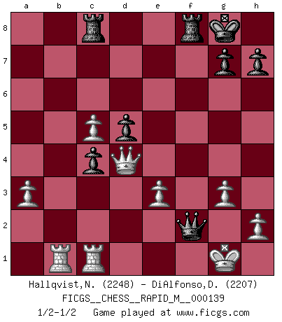 Last move : 1/2-1/2 2023 January 29 19:13:21 [Event "FICGS__CHESS__RAPID_M__000139"] [Site "FICGS"] [Date "2022.12.04"] [Round "1"] [White "Hallqvist,Niklas"] [Black "DiAlfonso,Darren"] [Result "1/2-1/2"] [WhiteElo "2248"] [BlackElo "2207"] 1.d4 Nf6 2.c4 e6 3.g3 Bb4+ 4.Nd2 d5 5.Bg2 O-O 6.Ngf3 dxc4 7.a3 Bxd2+ 8.Bxd2 Nc6 9.e3 b5 10.O-O Bb7 11.b3 Ne7 12.bxc4 bxc4 13.Qc2 Bd5 14.Bb4 c5 15.Bxc5 Ne4 16.Rfc1 f5 17.Qa4 Nxc5 18.dxc5 Rc8 19.Qxa7 Nc6 20.Qb6 Qf6 21.Rab1 Rb8 22.Qc7 Rbd8 23.Nd4 Rc8 24.Qb6 f4 25.Bxd5 exd5 26.Qb2 Nxd4 27.Qxd4 fxg3 28.fxg3 Qf2+ 29.Kh1 Qf3+ 30.Kg1 Qf2+ 1/2-1/2 Follow this game move after move (download)In Chess, at least, the brave inherit the earth. (Edmar Mednis) Woher wissen wir, daß der Neanderthaler Blindschach gespielt hat? -- Bei Ausgrabungen wurden keine Schachbretter und Figuren gefunden. (Anonymous) Alekhine es un poeta que crea un trabajo de arte de algo que raramente inspiraría a otra persona a mandar una tarjeta postal. (Max Euwe) Le génie consiste à savoir transgresser les règles au moment opportun. (Teichmann) The various flowers seem good to different people. (Chinese proverb)