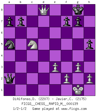 Last move : 1/2-1/2 2023 January 24 10:12:27 [Event "FICGS__CHESS__RAPID_M__000139"] [Site "FICGS"] [Date "2022.12.04"] [Round "1"] [White "DiAlfonso,Darren"] [Black "Javier,Christian"] [Result "1/2-1/2"] [WhiteElo "2207"] [BlackElo "2175"] 1.b4 e5 2.Bb2 Bxb4 3.Bxe5 Nf6 4.c3 Be7 5.e3 d5 6.Bxf6 Bxf6 7.d4 c5 8.g3 Nc6 9.Bg2 O-O 10.Nd2 cxd4 11.cxd4 Re8 12.Ne2 Bxd4 13.Nxd4 Nxd4 14.O-O Nc6 15.Nb3 Be6 16.Rc1 Qe7 17.Nc5 Rad8 18.Qa4 Rd6 19.Rfd1 Red8 20.Qb3 Bg4 21.Rxd5 Rxd5 22.Bxd5 Na5 23.Qd3 Qg5 24.Qe4 Qxd5 25.Qxg4 Qxa2 26.Rd1 Rxd1+ 27.Qxd1 h5 28.Qd8+ 1/2-1/2 Follow this game move after move (download)Fischer was a master of clarity and a king of artful positioning. His opponents would see where he was going but were powerless to stop him. (Bruce Pandolfini) Es gibt Leute, die glauben, alles wäre vernünftig, was man mit einem ernsthaften Gesicht tut. (Georg Christoph Lichtenberg) Si un gobernante no entiende al Ajedrez, ¿como puede governar él un reinado?. (El Rey Khusros II) Toutes choses étant égales, c'est la conviction qui gagne. Alliée à une volonté de vaincre, elle sert de détonateur, suscite des idées, disperse les doutes et aide à penser clairement. (Robert Fischer) The worth of a book is to be measured by what you can carry away from it. (James Bryce)