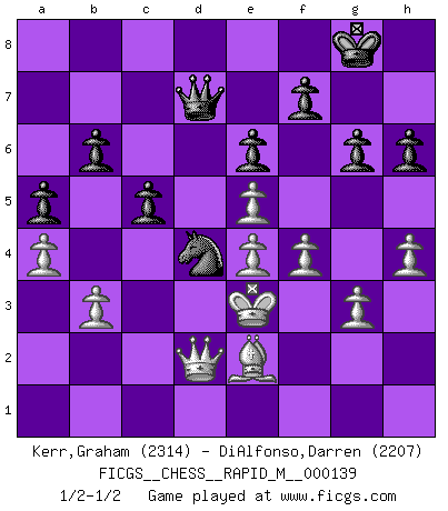 Last move : 1/2-1/2 2023 March 10 1:43:2 [Event "FICGS__CHESS__RAPID_M__000139"] [Site "FICGS"] [Date "2022.12.04"] [Round "1"] [White "Kerr,Graham"] [Black "DiAlfonso,Darren"] [Result "1/2-1/2"] [WhiteElo "2314"] [BlackElo "2207"] 1.d4 Nf6 2.c4 e6 3.Nf3 d5 4.g3 Bb4+ 5.Bd2 Be7 6.Bg2 O-O 7.O-O c6 8.Qc2 b6 9.Ne5 Bb7 10.Re1 Nbd7 11.cxd5 Nxe5 12.dxe5 Nxd5 13.a3 c5 14.e4 Nc7 15.Nc3 Qd7 16.h4 h6 17.Rad1 Nb5 18.Ne2 Rfc8 19.Bg5 Qe8 20.Bxe7 Qxe7 21.Rd2 a5 22.Red1 Bc6 23.f4 Be8 24.Kh2 Rab8 25.Bh3 Rd8 26.Bg4 Rbc8 27.Rxd8 Rxd8 28.Rxd8 Qxd8 29.Kg2 Na7 30.Kf2 Bb5 31.Ke3 Bxe2 32.Bxe2 Nc6 33.Qd3 Nd4 34.a4 Qe8 35.b3 g6 36.Qd1 Qd7 37.Qd2 1/2-1/2 Follow this game move after move (download)Why must I lose to this idiot ? (Aron Nimzovich) Man wirke der falschen Auffassung entgegen, als ob jeder Zug Unmittelbares zu leisten habe; auch Werte- und Ruhezüge haben ihre Existenzberechtigung. (Aaron Nimzowitsch) No puedes jugar al Ajedrez si eres de corazón noble. (Proverbio Francés) Il (Jacob Murray) ne joue pas pour le bon coup, mais pour le meilleur. (Eloi Relange) Players are not good because they find tactics, it is about the way to find the positions in which those tactics are hidden. (Luc-Olivier Leclerc)