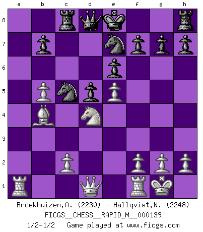 Last move : 1/2-1/2 2023 January 11 9:18:6 [Event "FICGS__CHESS__RAPID_M__000139"] [Site "FICGS"] [Date "2022.12.04"] [Round "1"] [White "Broekhuizen,A. T. S."] [Black "Hallqvist,Niklas"] [Result "1/2-1/2"] [WhiteElo "2230"] [BlackElo "2248"] 1.e4 e6 2.d4 d5 3.Nc3 Bb4 4.e5 c5 5.Bd2 Ne7 6.Nf3 cxd4 7.Nb5 Bc5 8.b4 a6 9.bxc5 axb5 10.Bxb5+ Bd7 11.a4 Na6 12.O-O Nxc5 13.Bb4 Bxb5 14.axb5 Rc8 15.Nxd4 1/2-1/2 Follow this game move after move (download)Chess is so inspiring that I do not believe a good player is capable of having an evil thought during the game. (Wilhelm Steinitz) Kombinieren und Schwarzhandel gehören verboten. (Savielly Grigorievitsch Tartakower) Una victoria por una combinación errónea, aunque sea espectacular, me llena de horror artístico. (Wilhelm Steinitz) Si rien de grave n'est détecté lors de l'analyse d'une position, on joue alors le coup. Seconde règle de Blumenfeld. Sometimes it pays to stay in bed in Monday, rather than spending the rest of the week debugging Monday's code. (Dan Salomon)