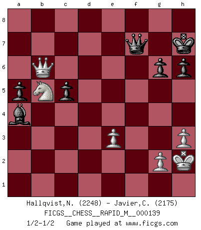 Last move : 1/2-1/2 2023 April 6 21:26:41 [Event "FICGS__CHESS__RAPID_M__000139"] [Site "FICGS"] [Date "2022.12.04"] [Round "1"] [White "Hallqvist,Niklas"] [Black "Javier,Christian"] [Result "1/2-1/2"] [WhiteElo "2248"] [BlackElo "2175"] 1.Nf3 Nf6 2.c4 c6 3.e3 a6 4.Nc3 d5 5.d4 e6 6.b3 Bb4 7.Bd2 O-O 8.Bd3 Nbd7 9.O-O Bd6 10.Qc2 h6 11.e4 dxc4 12.bxc4 e5 13.c5 Bc7 14.Be3 Ng4 15.Ne2 Qe7 16.Rab1 Rb8 17.h3 Nxe3 18.fxe3 Rd8 19.Rb3 Nf6 20.Rb2 Kh8 21.a4 a5 22.Rfb1 Rg8 23.Qc4 Re8 24.Nd2 Rd8 25.Qc1 Nh5 26.Qf1 Nf6 27.Kh1 Nd7 28.Bc4 Rf8 29.Qd1 b6 30.cxb6 Rxb6 31.Rxb6 Nxb6 32.Bd3 Bd7 33.Qc2 Rb8 34.Nf3 Kh7 35.dxe5 Bxe5 36.Ned4 c5 37.Nxe5 Qxe5 38.Nf3 Qc7 39.e5 g6 40.Bb5 Be6 41.Nd4 Bd5 42.e6 Nc4 43.Bxc4 Rxb1+ 44.Qxb1 Bxc4 45.Nb5 Qb7 46.exf7 Qxf7 47.Kh2 Bb3 48.Qe4 Qe6 49.Qb7+ Qf7 50.Qb6 Bxa4 1/2-1/2 Follow this game move after move (download)Live, lose, and learn, by observing your opponent how to win. (Amber Steenbock) Die meiste Zeit treffe ich auf Gegner, die meine Enkel sein könnten. Ich bin da, um ihnen zu zeigen, dass sie von mir noch einiges lernen können. (Viktor Kortschnoi) Nos gusta pensar. (Gary Kasparov) On a dit que l'homme se distingue de l'animal par le fait qu'il achète plus de livres qu'il ne peut en lire. Je voudrais suggérer qu'inclure à la liste des livres quelques livres d'échecs rendrait la distinction manifeste. (Edward Lasker) The obstacle is the path. (Zen proverb)